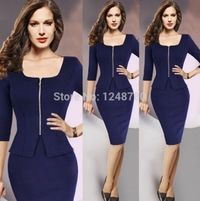 Դիմացի հատվածը շղթայով կիսաշրջազգեստի մասը մատիտաձև, 3/4 թևերով, մուգ կապույտ շրջազգեստ