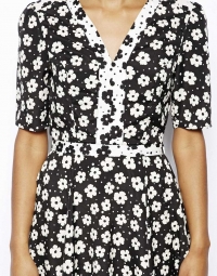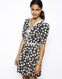 100% պոլիեսթերից պատրաստված, ծնկներից մի փոքր բարձր, ընդգծված կոնքային հատվածով, ծաղկավոր, վզի սրտածև բացվածքով շրջազգեստ: