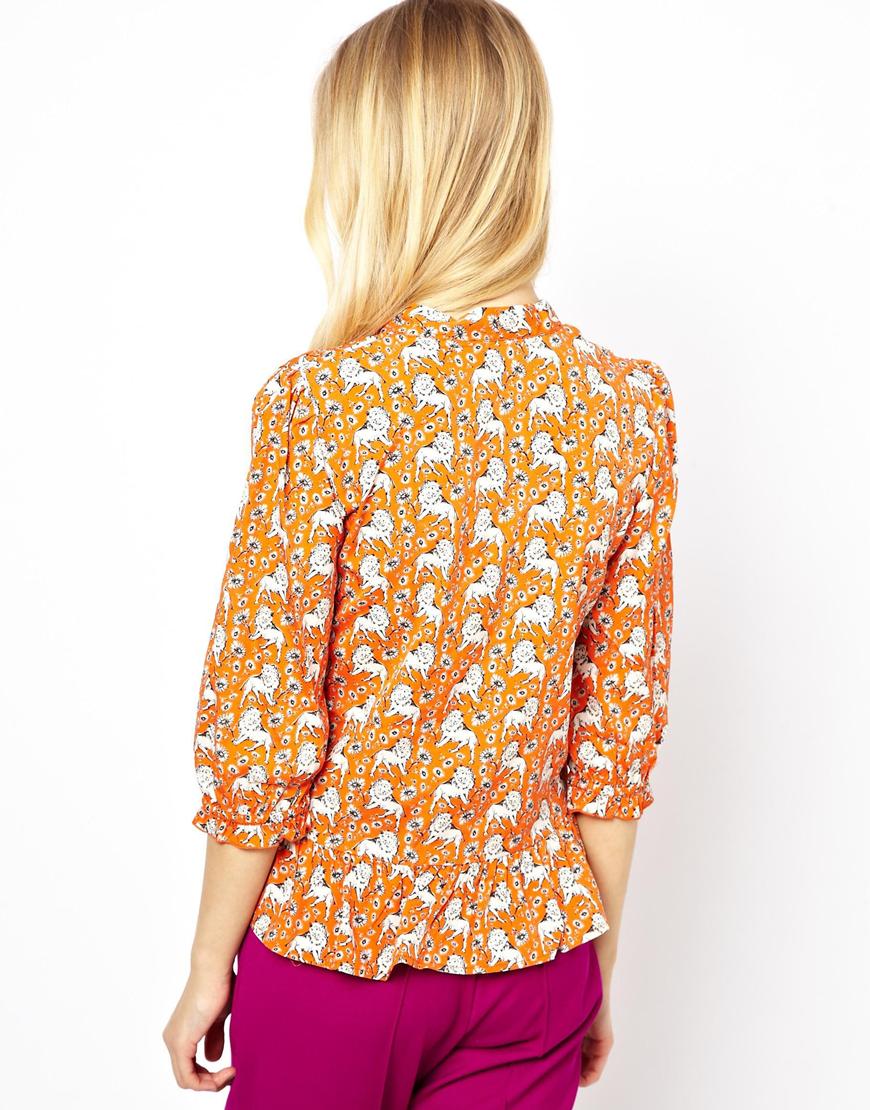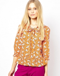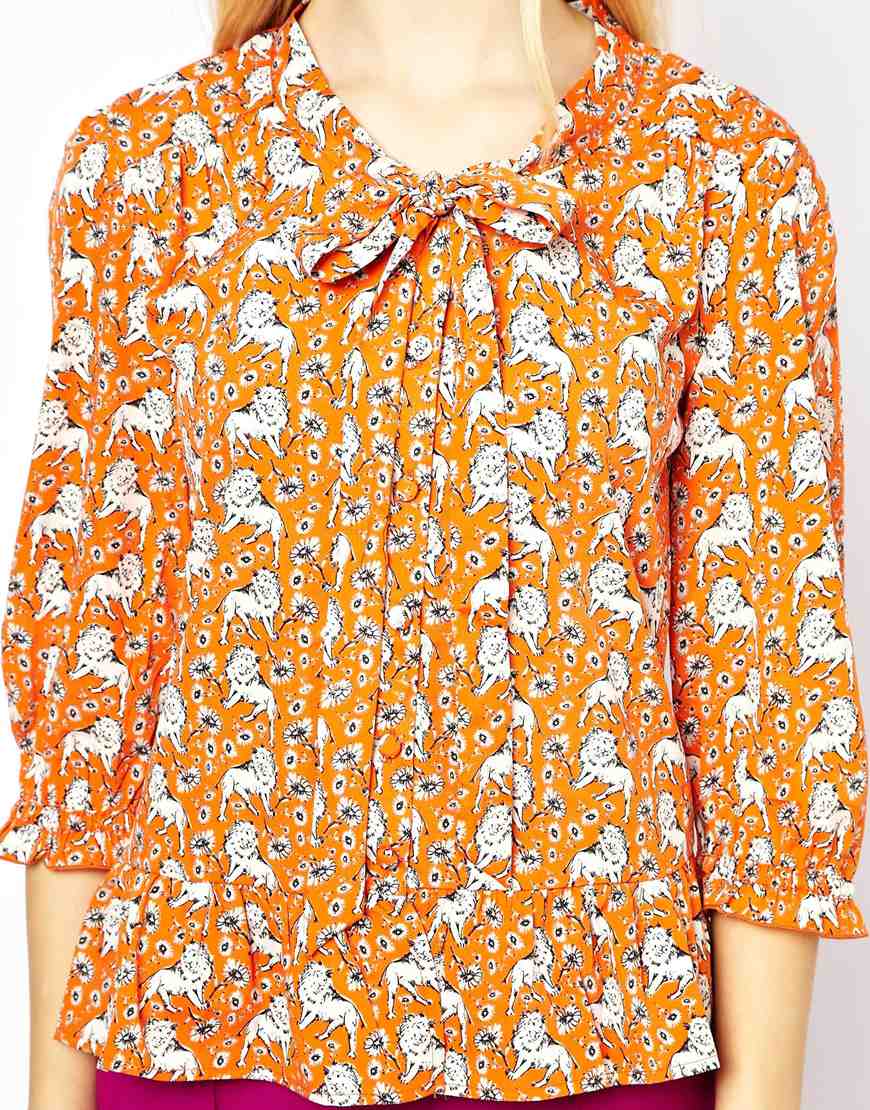 Նարնջագույն, կլոր, բանտային էֆեկտով վզով, վերևից ներքև իջնող դարսերով, փոքր գեղեցիկ առյուծների նախշով վերնաշապիկ: