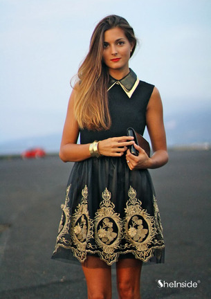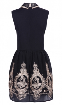 Փակ օձիքով, մետաքսյա կտորից, գոտկային հատվածում էլաստիկ, ներքևի հատվածում հետաքրքիր նախշային լուծումներով շրջազգեստ: