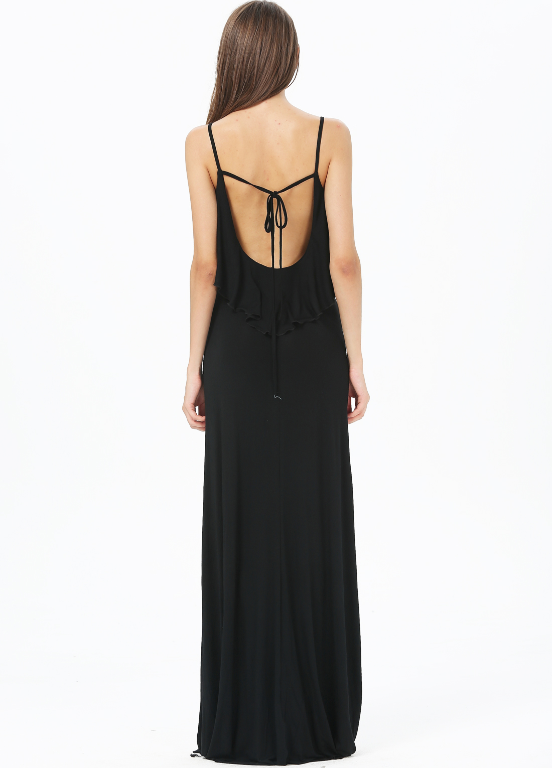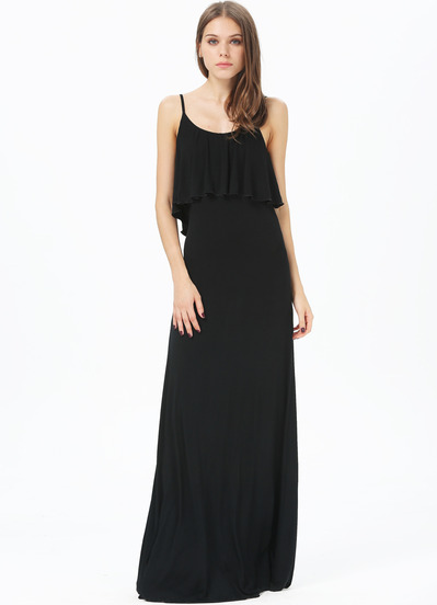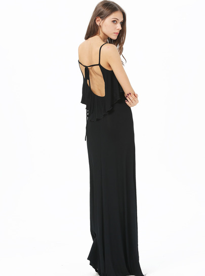 Սև գույնից, հետևի մասում իրար կապվող ուսակապերով երեկոյան, երկար շրջազգեստ: