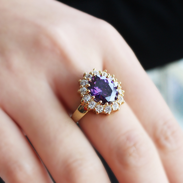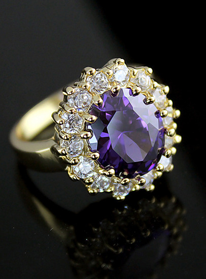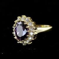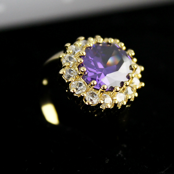 Մեծ մանուշակագույն և փոքր թափանցիկ քարերով ոսկեգույն մատանի: