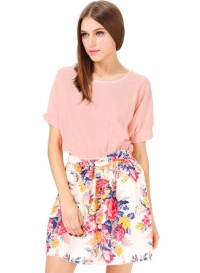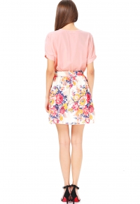 Ծաղկավոր կիսաշրջազգեստով, հասարակ, կարճ, կոնքային հատվածում ծաղկային կտորից գոտիով շրջազգեստ: