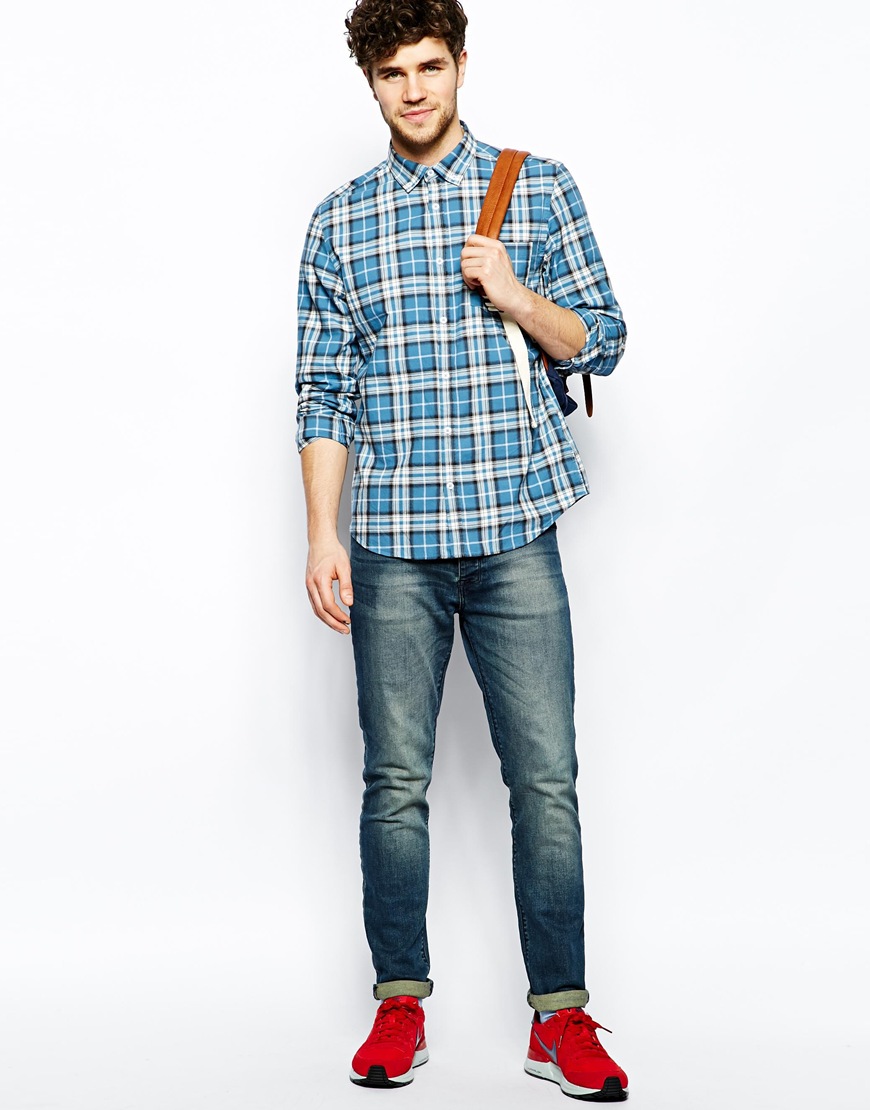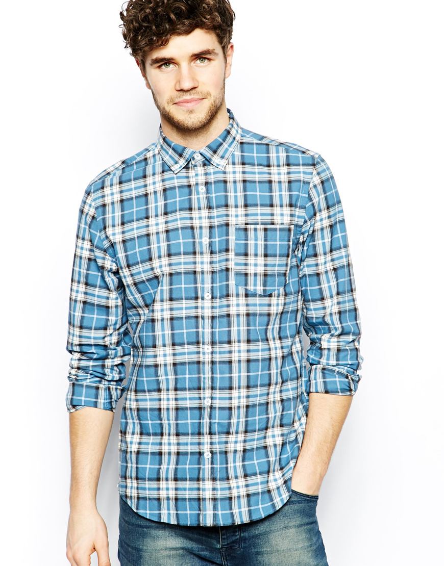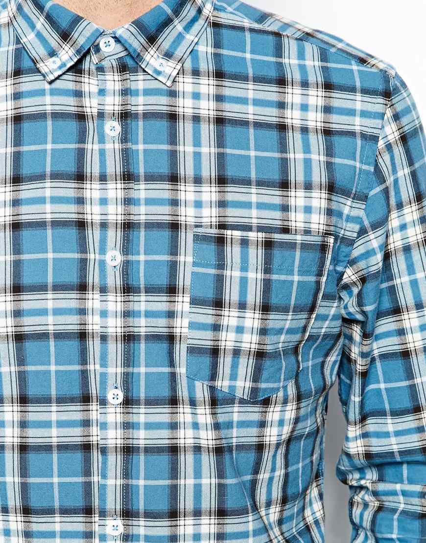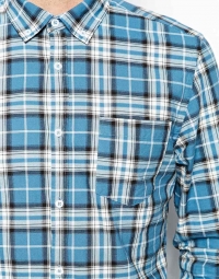 Մուգ և բաց, վանդակավոր կապույտ կտորից, երկարաթև վերնաշապիկ:
