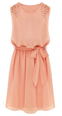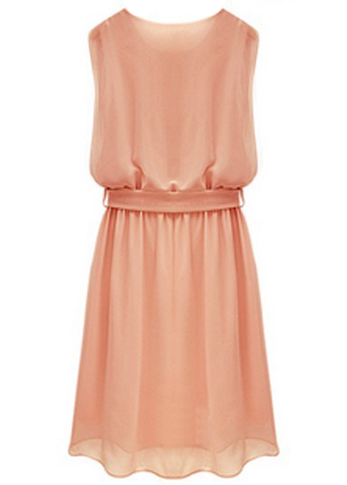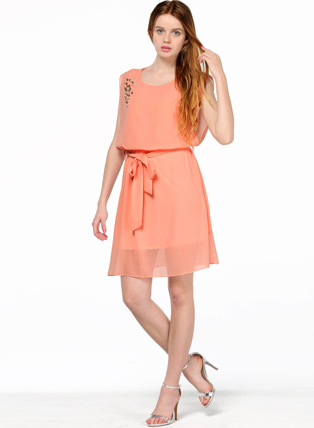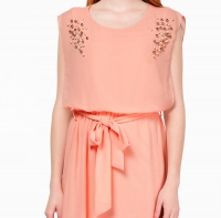 Անթև, վզի կլոր բացվածքով. միջին երկարությամբ, գոտկային հատվածում կտորե գոտիով, ուսերի հատվածում հուլունքազարդ, ամենօրյա, վառ շրջազգեստ: