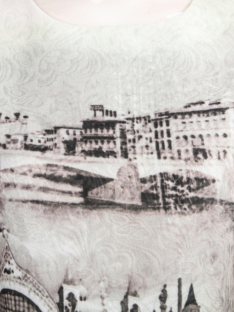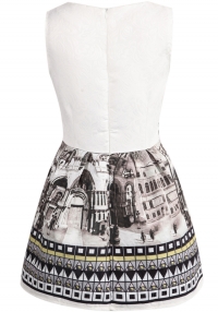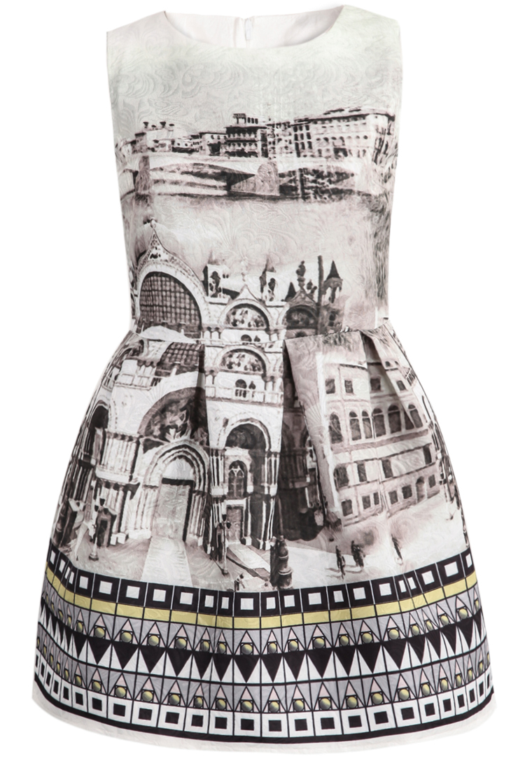 Ամառային, կարճ, առանց թևերի, միջնադարյան շենքերի պատկերով շրջազգեստ: