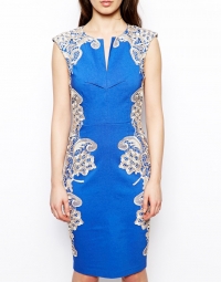 Կապույտ կտորի վրա ժանյակավոր կտորից նախշազարդ, կարճ, վզի սուր կտրվածքով, վերևից ուղիղ իջնող նուրբ շրջազգեստ: