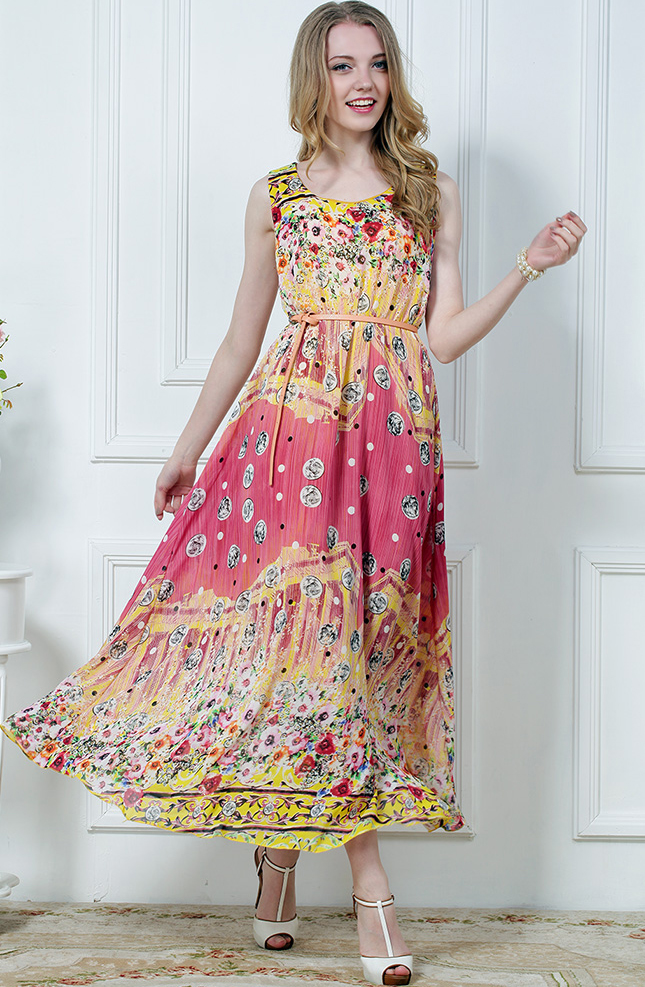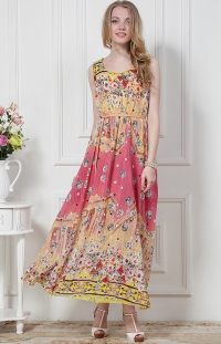 Կարմիրի և դեղինի երանգներից, նախշային լուծումներով, երկար, վզի կլոր բացվածքով, անթև շրջազգեստ: