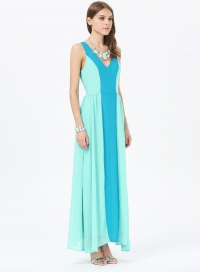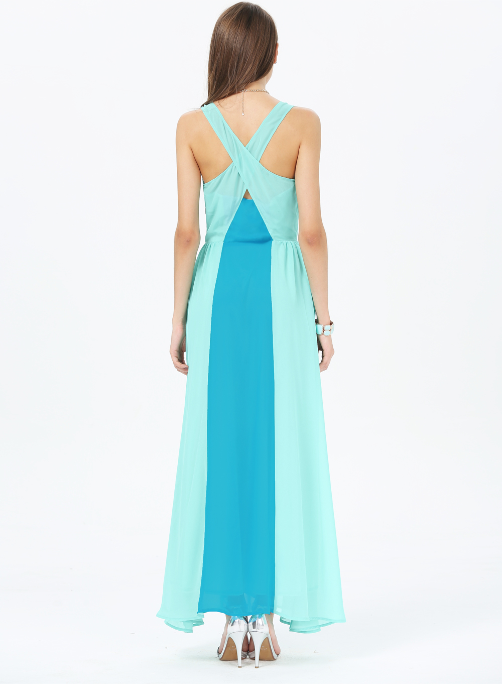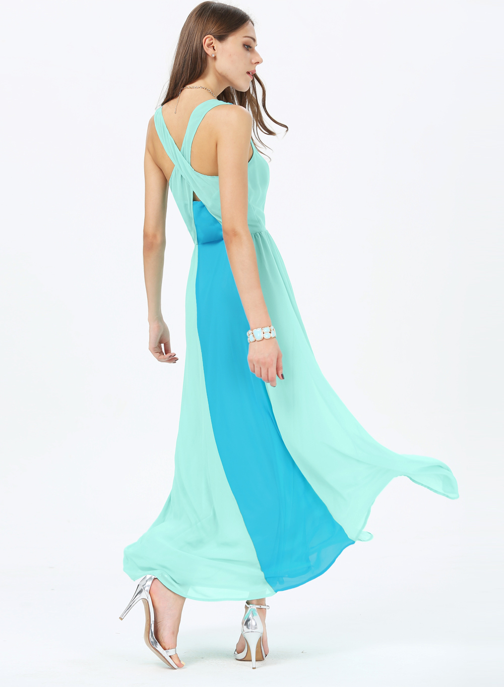 Վզի սրտաձև բացվածքով, մեջքային հատվածում խաչվող ուսակապերով, կապույտ գույնի երանգներով համադրված, գեղեցիկ, երկար շրջազգեստ: