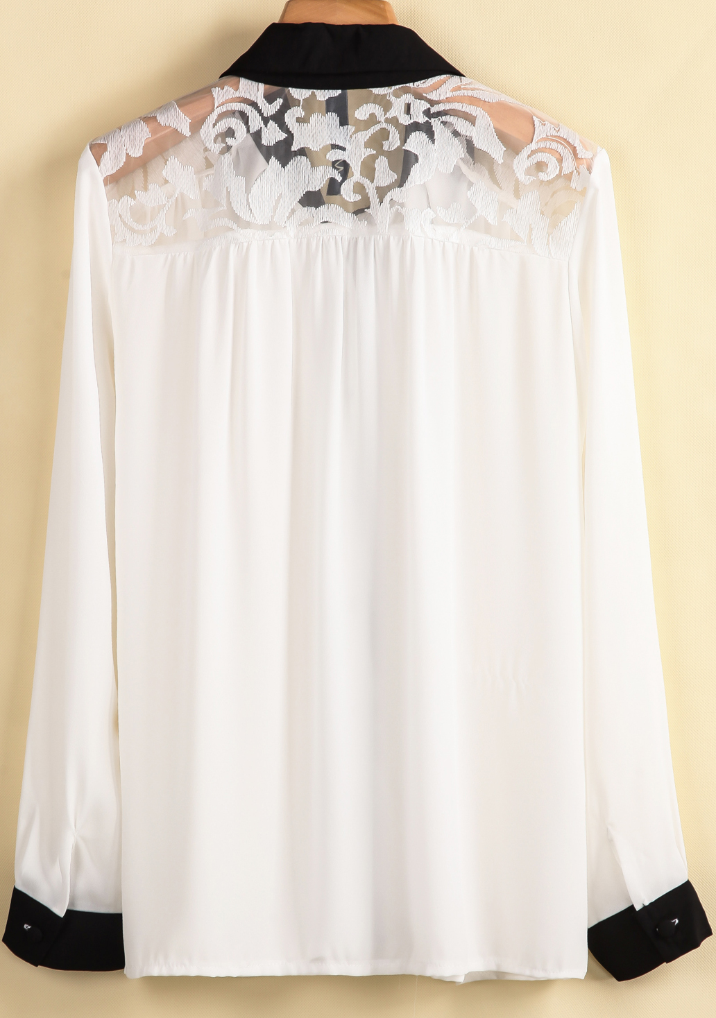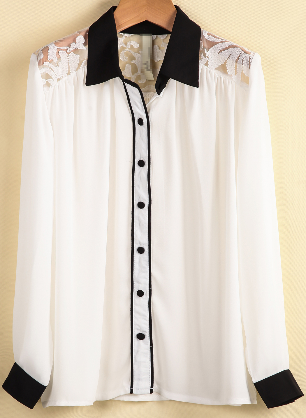 Օձիքով, երկարաթև, թևերի և օձիքի հատվածում եզերված սև կտորով, ուսերի հատվածում ժանյակավոր, գործնական, դասական վերնաշապիկ:
