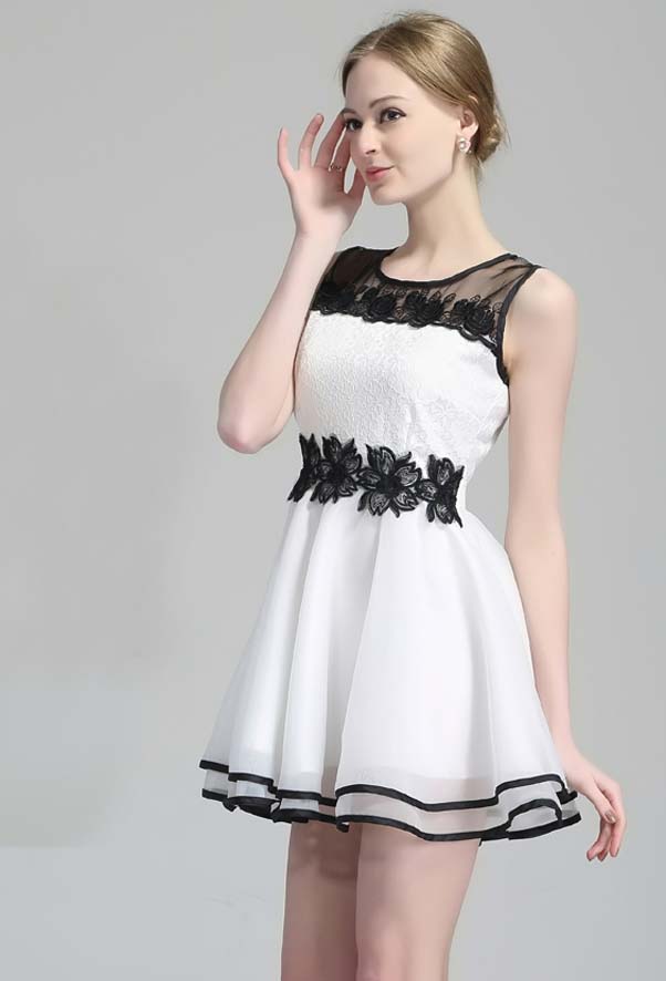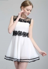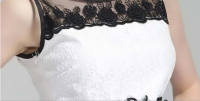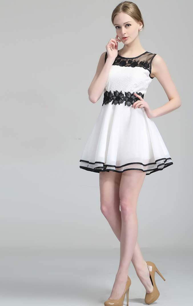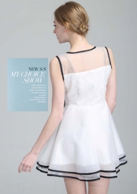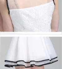 Վզի կլոր բացվածքով, կիսաշրջազգեստի հատվածքում ցանցային եռաշերտ կտորից, ժանյակավոր գոտիով, ուսերի և գոտկային հատվածի ժանյակավոր կտորը առանձնացվում է սև գույնով, ամբողջությամբ սպիտկա, եզերված սև բարակ շերտով, կարճ, գրավիչ շրջազգեստ: