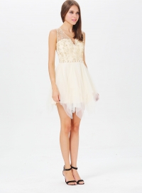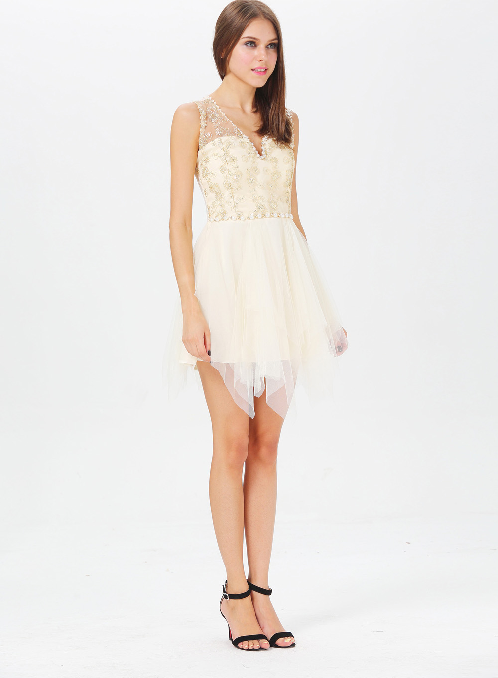 Վզի սրտաձև բացվածքով, անթև, մեջքային հատվածում ցանցապատ, առջից մինչև կոնքային հատվածը հուլունքազարդ, կիսաշրջազգեստի հատվածում եռանկյունաձև փոռերով, նորաձև, կարճ, երեկոյան շրջազգեստ: