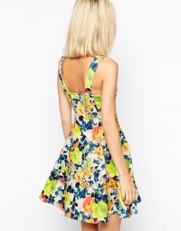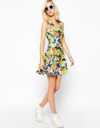 Վզի սրտաձև բացվածքով, կարճ, ծաղկային վառ գունավորմամբ շրջազգեստ: