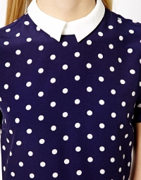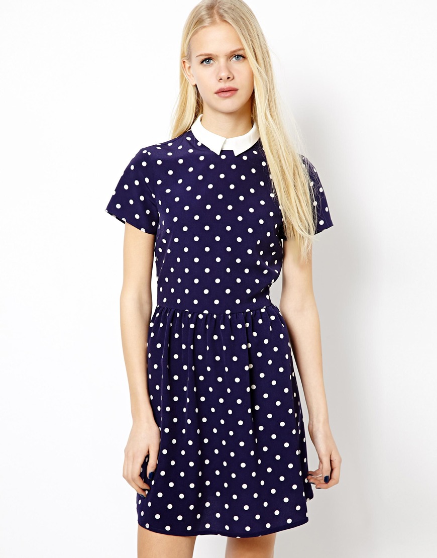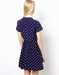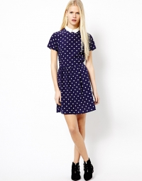 Առանձնացված սպիտակ օփիքով, կարճ, գոտկային հատվածում էլաստիկ, կիսաթև, ամենօրյա կապույտ շրջազգեստ, ամբողջությամբ պատված սպիտակ պուտեով:
