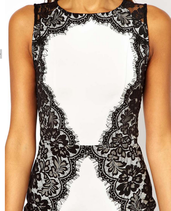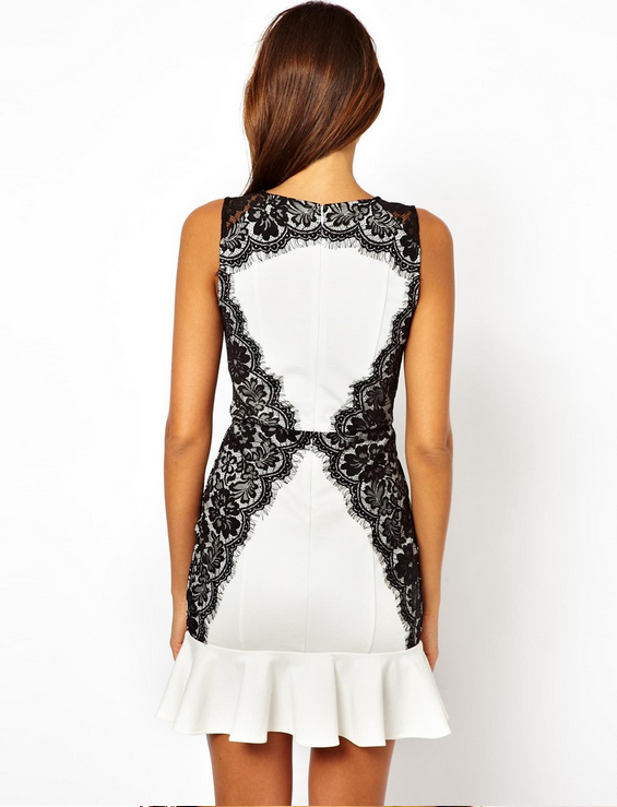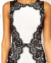 Վզի կլոր բացվածքով, անթև, սպիտակ ֆոնի վրա ժանյակավոր կտորից նախշերով, գեղեցիկ, գործնական շրջազգեստ: