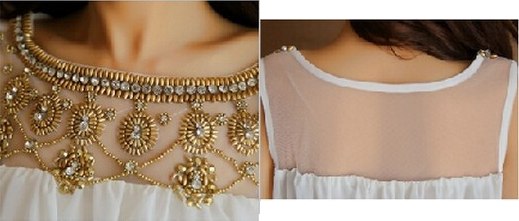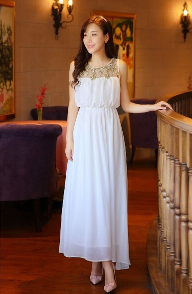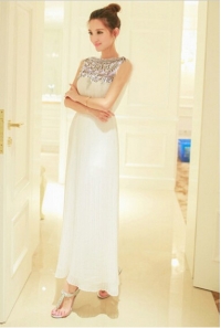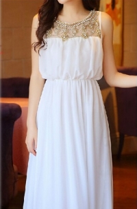 Վզի կլոր բացվածքով, գոտկային հատվածում էլաստիկ, վզային հատվածում զարդարված հուլունքներվ, երկար երեկոյան շրջազգեստ: