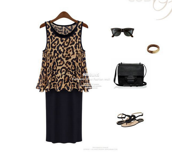Անթև, վզի կոր բացվածքով, վագրային նախշով և սև, դասական շրջազգեստ: