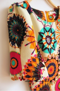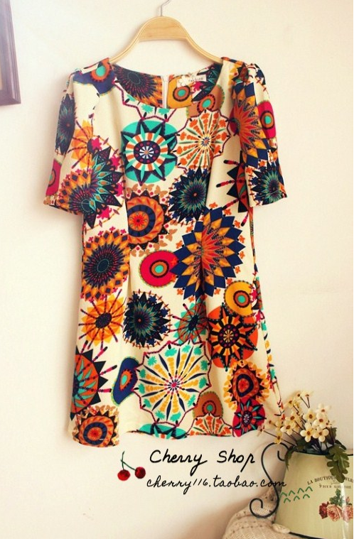 Վզի կլր բացվածքով, կիսաթև, վերևից ուղիղ իջնող, բազմագույն նախշերով, ամենօրյա գեղեցիկ շրջազգեստ:
