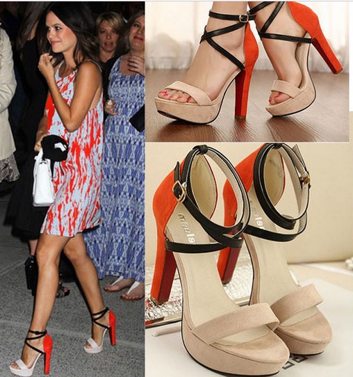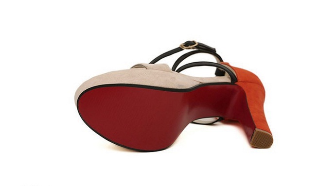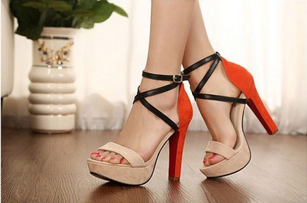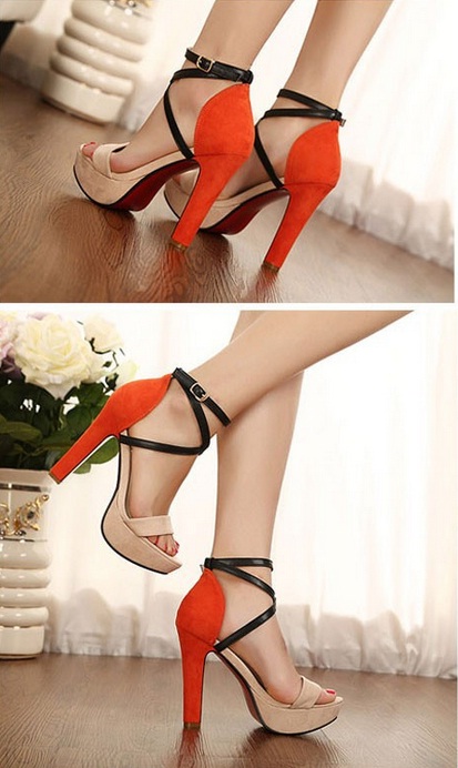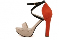 Կրունկի հատվածում նարնջագույն, առաջամասում մարմնագույն և սև կապիչներով, գույների նուրբ համադրությամբ, գեղեցիկ բարձրակրունկ կոշիկներ: