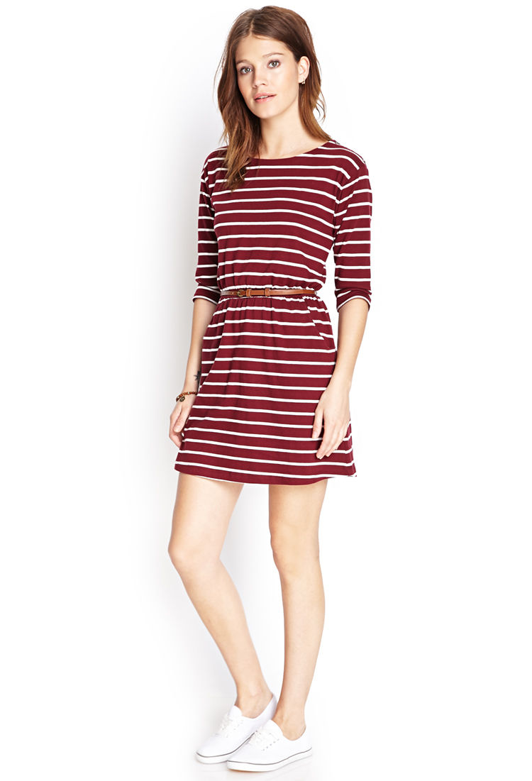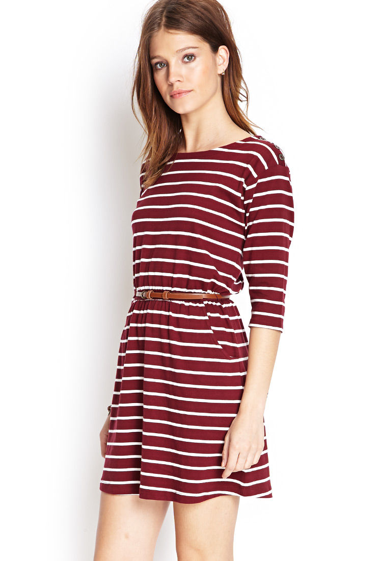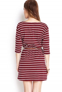 Վզի կլոր բացվածքով, 3/4 թևերով, կարմիր և սպիտակ գծավոր, գոտկային հատվածում բարակ գոտիով, կարճ, ամենօրյա շրջազգեստ: