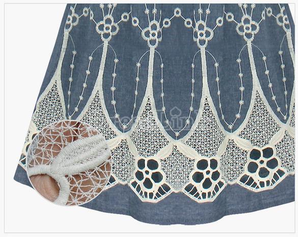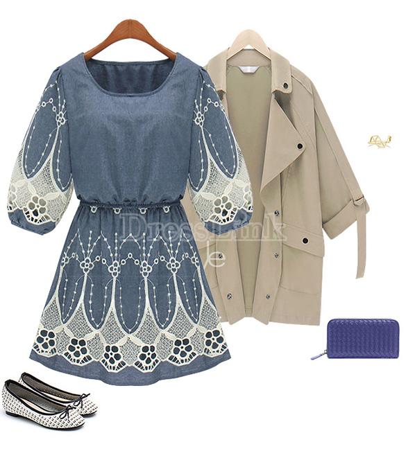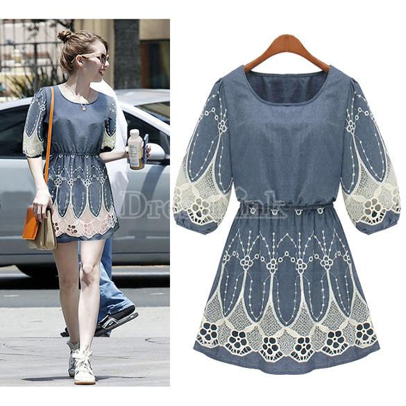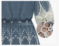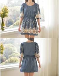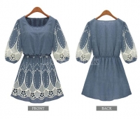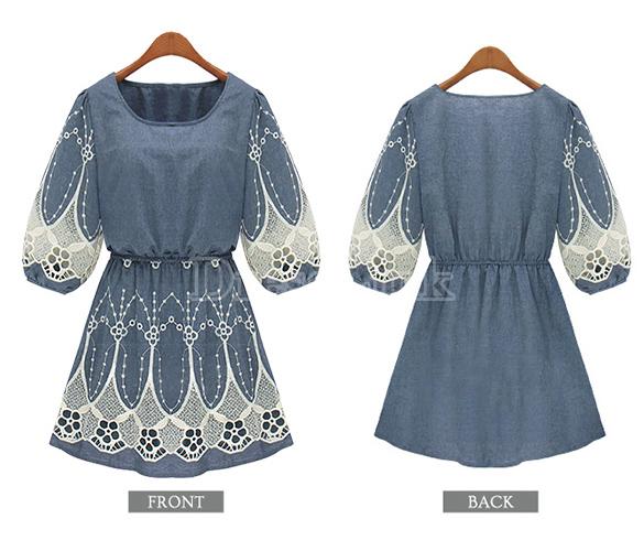 Վզի կլոր բացվածքով, կիսաթև, թևերը և կիսաշրջազգեստի հատվածը ժանյակավոր, կարճ, ամենօրյա, ջինսե շրջազգեստ:
