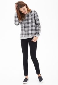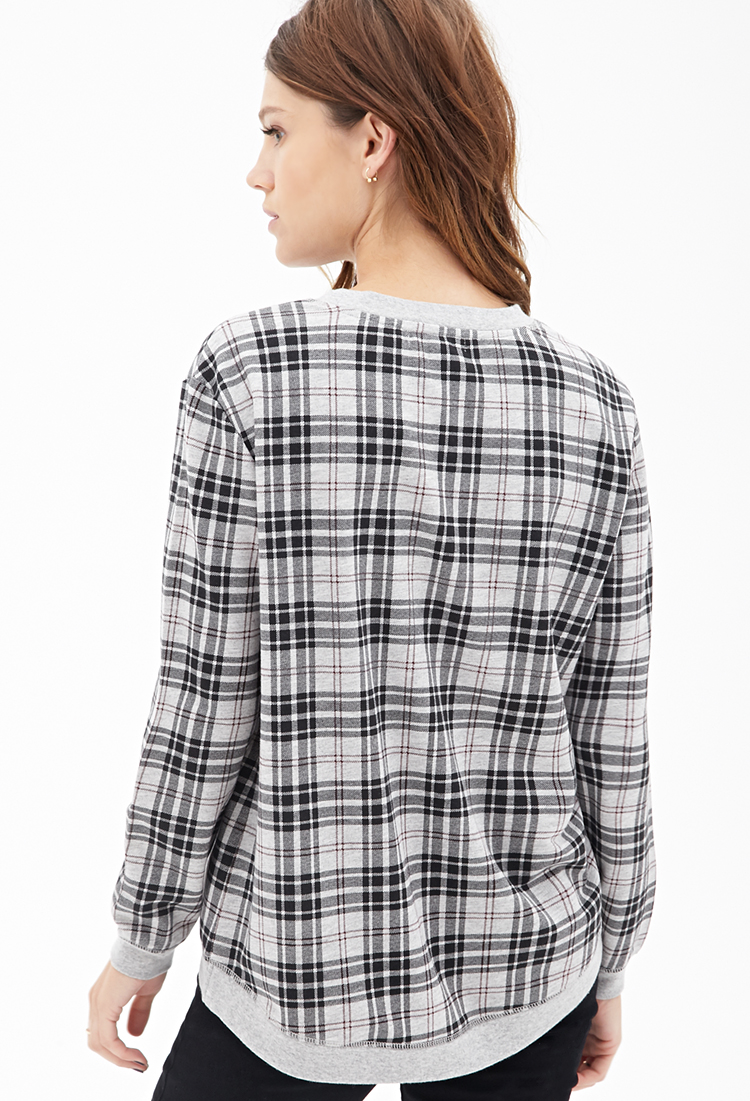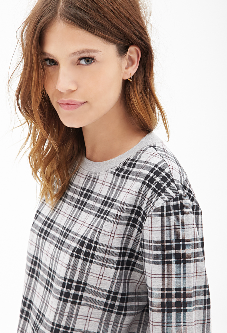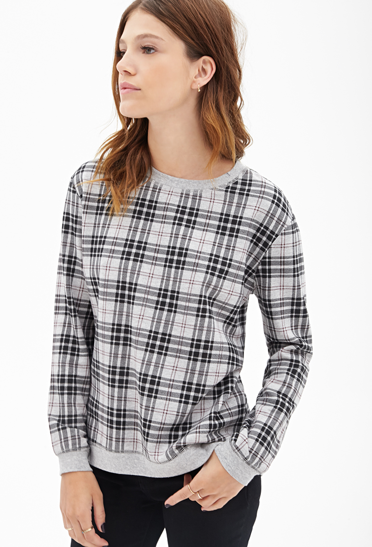 Վզի կլոր բացվածքով, երկարաթև, մոխրագույնի և սևի համադրությամբ վանդակների պատկերով, գեղեցիկ բլուզ: