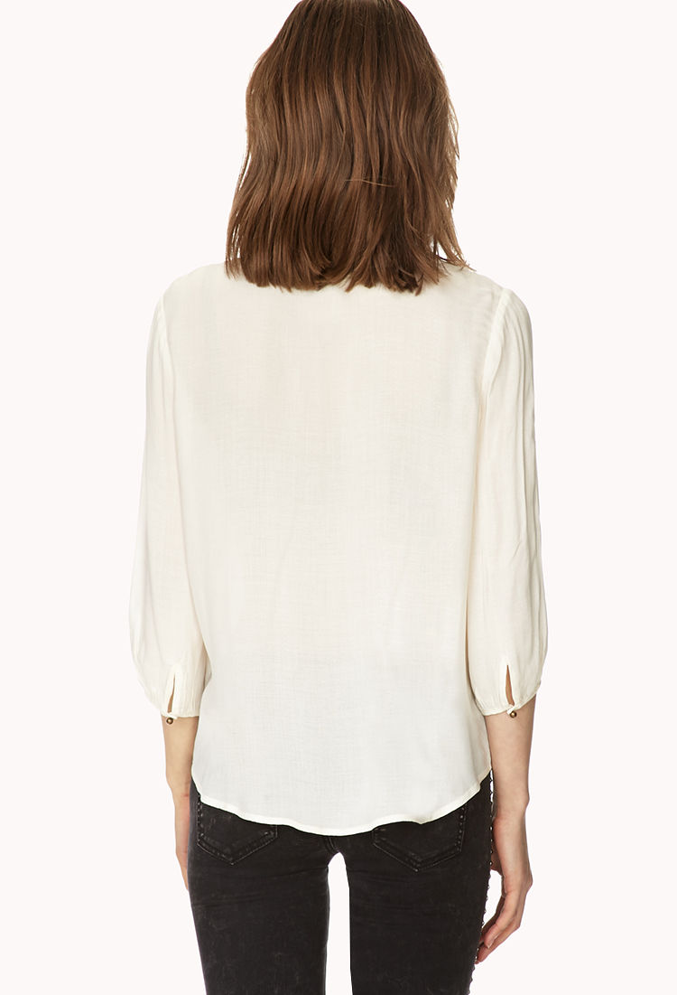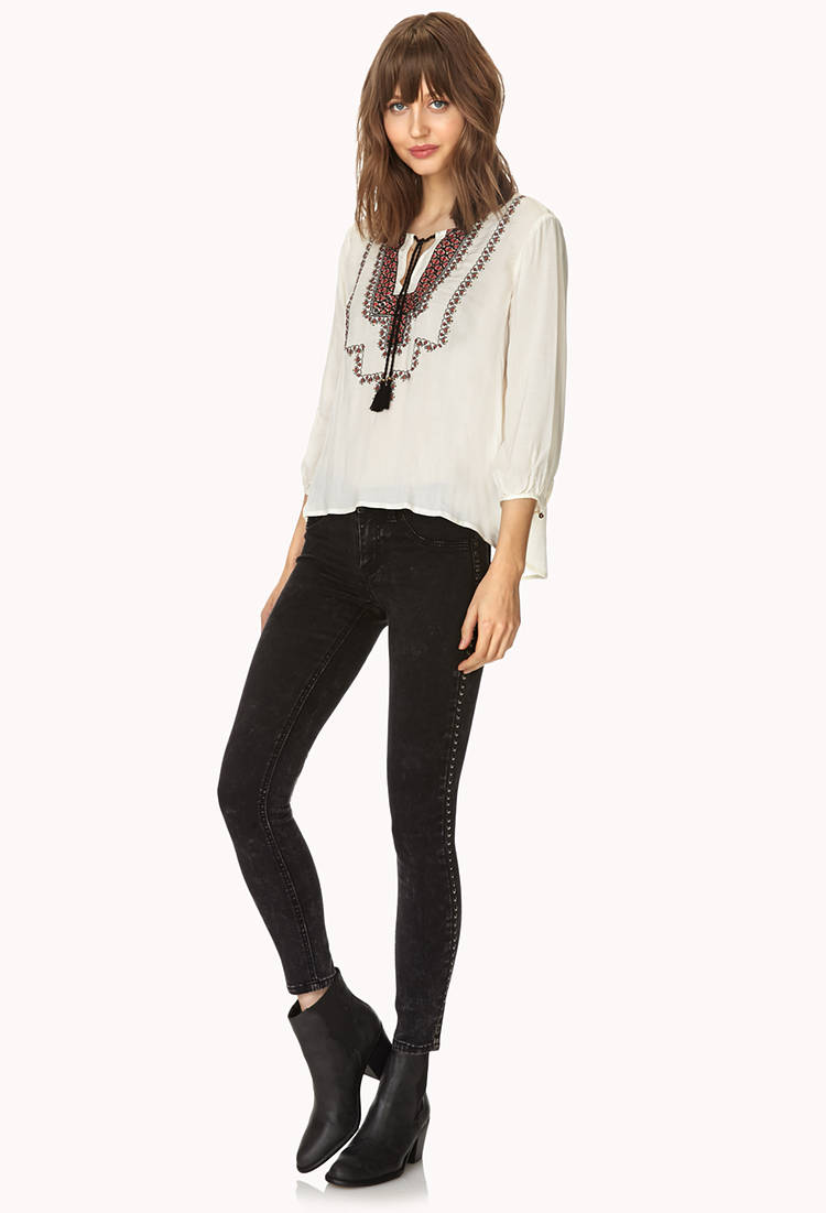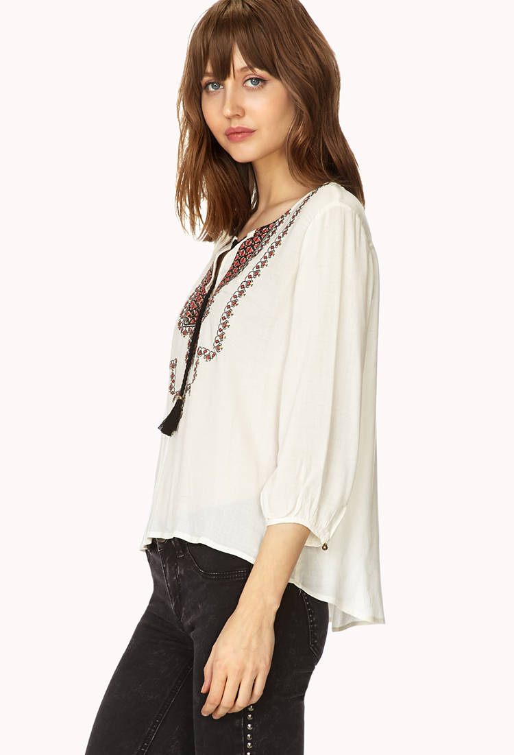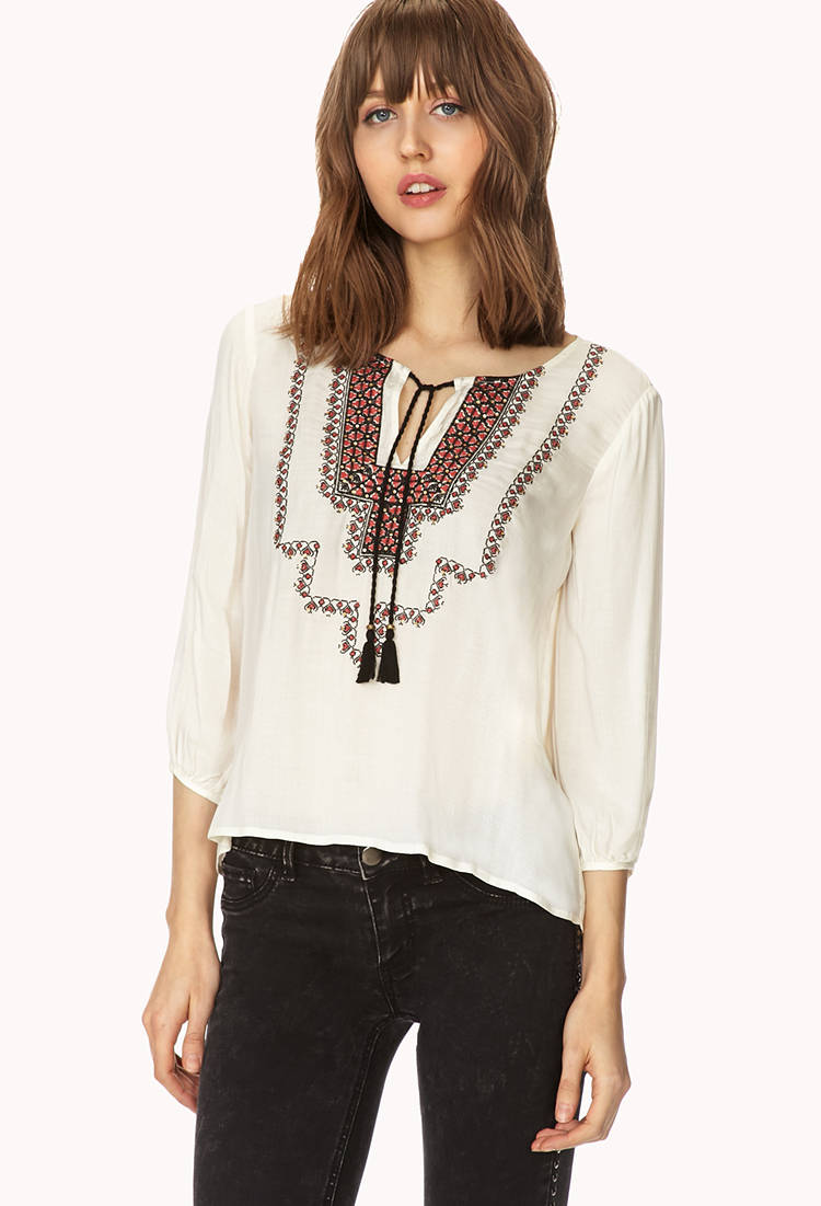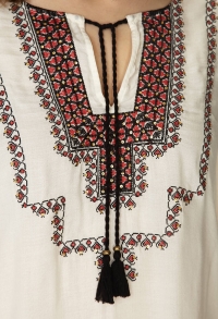 Վզի կլոր բացվածքով, ասիմետրիկ, առաջամասում ասեղնագործ, գեղեցիկ նախշերով, առօրյա, էթնիկ և ազատ ոճը նախընտրողների համար, գեղեցիկ բլուզ: