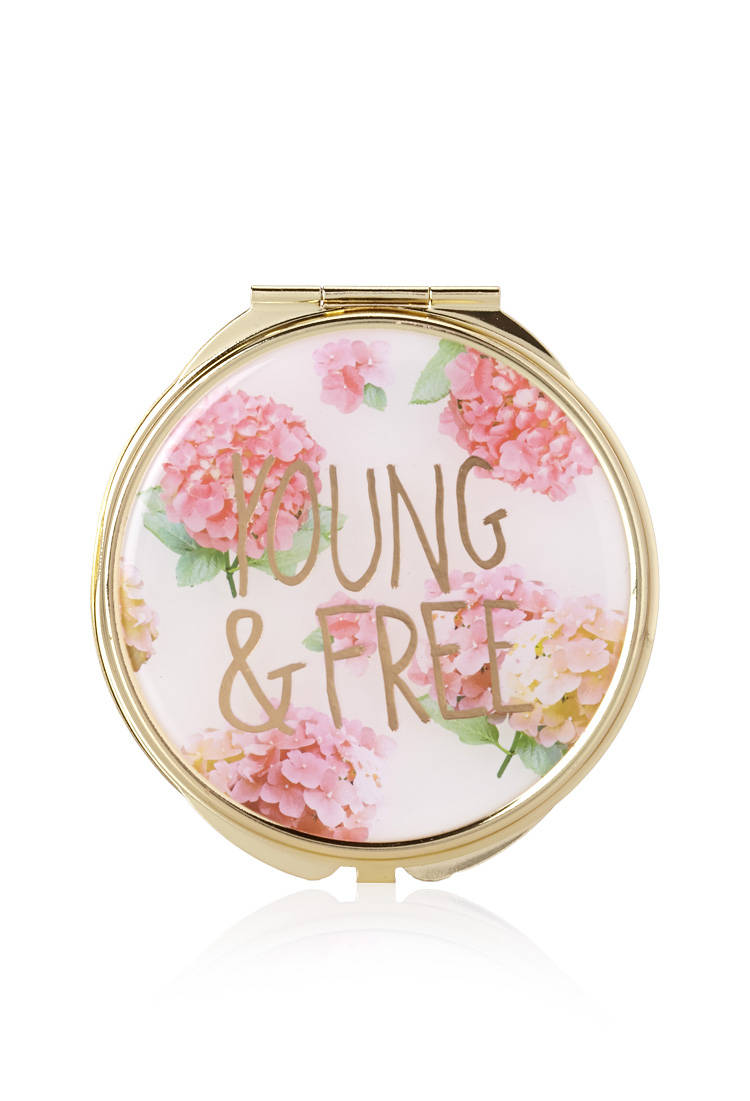 "Young & Free" գրառումով, վարդագույն ծաղիկներով, գեղեցիկ, փոքր հայելի: