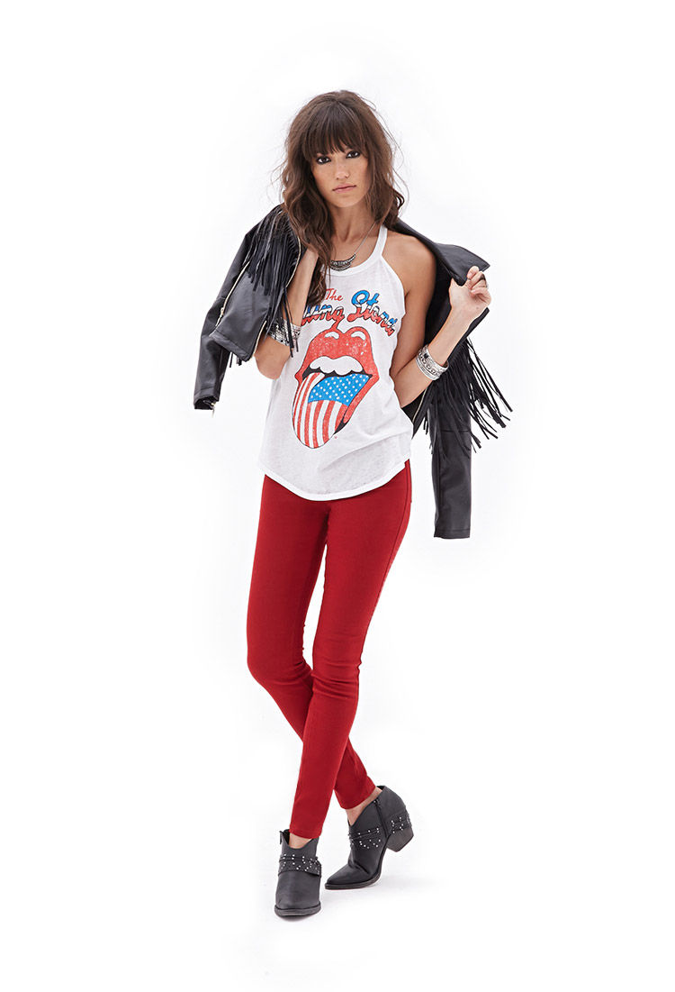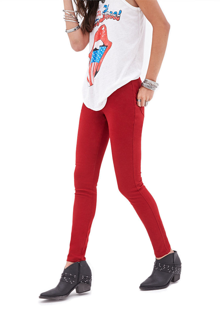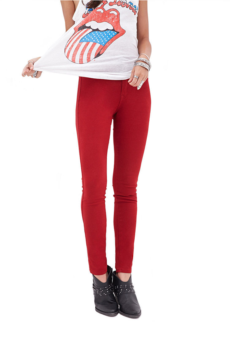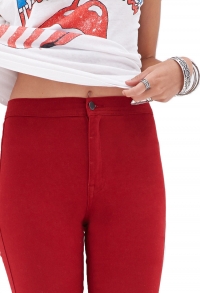 Կոնքային, վերևից նեղացող, հասարակ, վառ կարմիր գունավորմամբ, գեղեցիկ տաբատ: