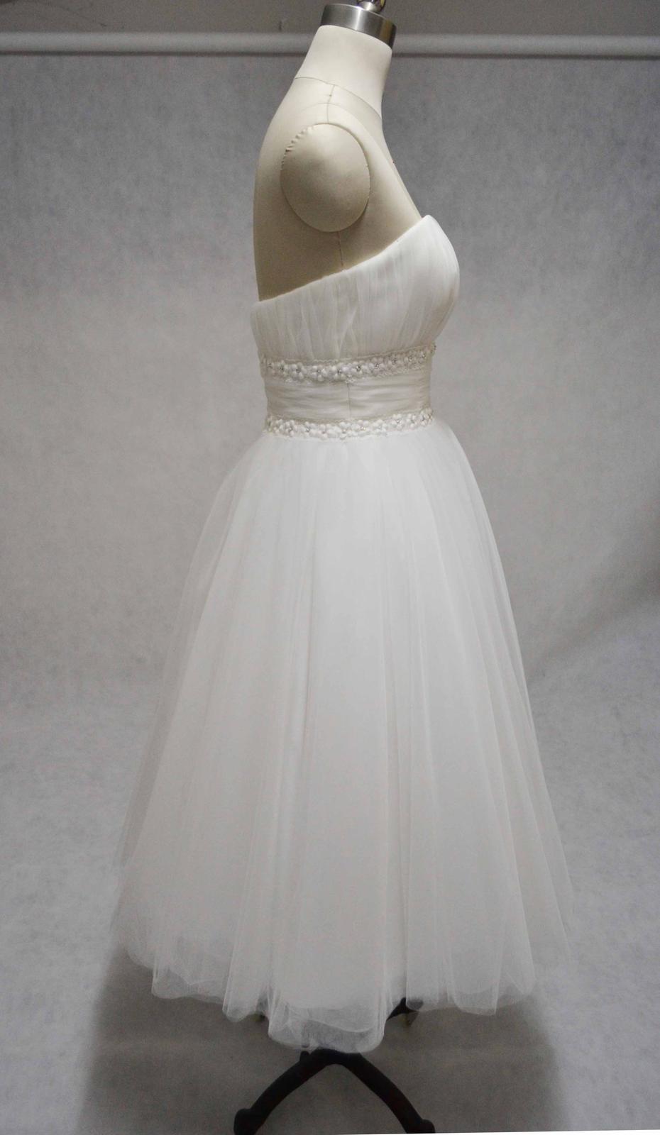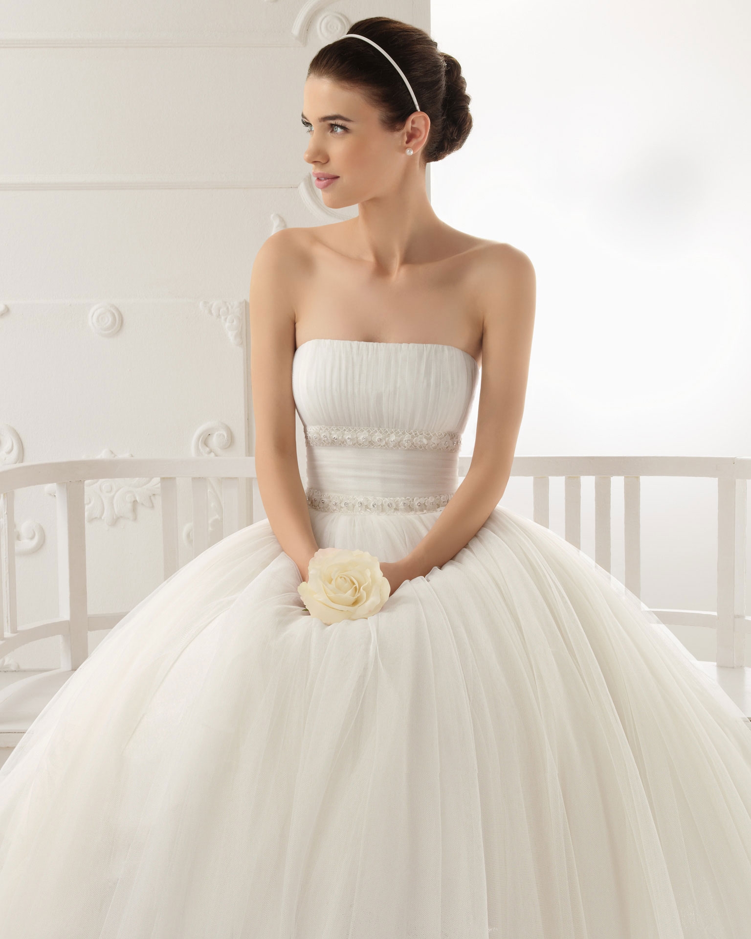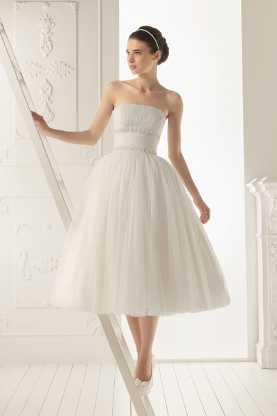 Առանց ուսակապերի, կրծքավանդակից ներքև հաստ կտորե գոտիով, գոտկային հատվածից ներքև լայնացող, միջին երկարության, հասարակ, գեղեցիկ հարսանեկան զգեստ: