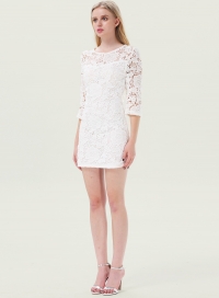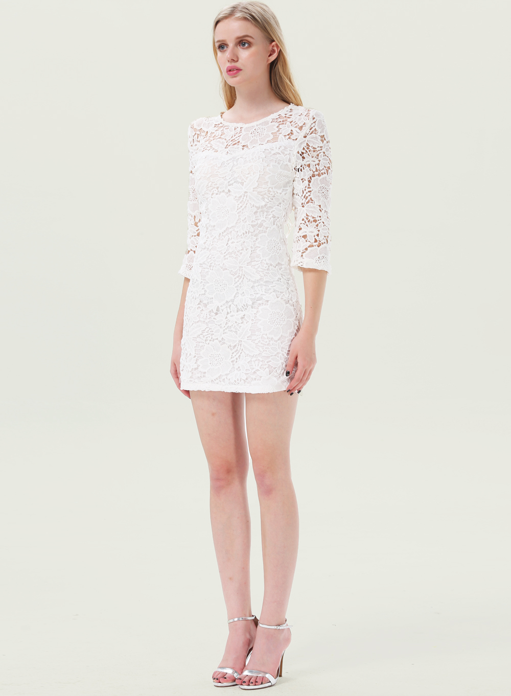 Վզի կլոր բացվածքով, 3/4 թևերով, կարճ, ամբողջությամբ ժանյակավոր, մեջքային հատվածի հետաքրքիր բացվածքով, գրավիչ և յուրօրինակ շրջազգեստ: