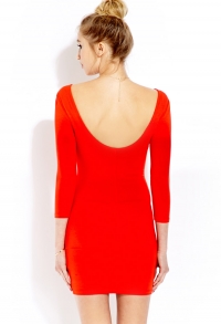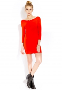 Վզի լայնակի բացվածքով, մեջքային հատվածում լայն կլոր բացվածքով, 3/4 թևերով, վառ կարմիր գունավորմամբ, մինի կոկտելային շրջազգեստ: