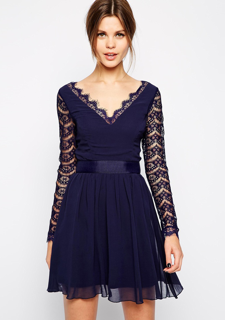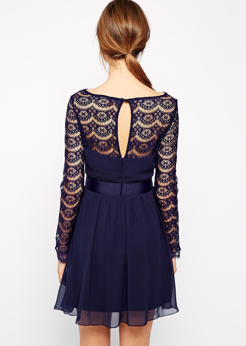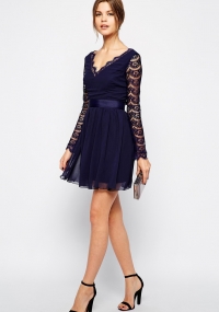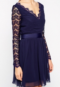 Վզի սրտաձև բացվածքով, երկարաթև, կարճ,գոտկային հատվածում մետաքսե գոտիով, դարսերով, նորաձև երեկոյան-կոկտելային շրջազգեստ: