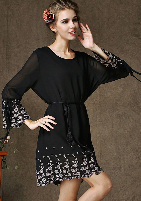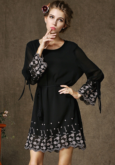 Վզի կլոր բացվածքով, երկարաթև, ծայրերն ամբողջությամբ ժանյակավոր, գոտկային հատվածում գոտիով, թևերի հատվածում կապիչներով, կարճ, նորաձև շրջազգեստ: