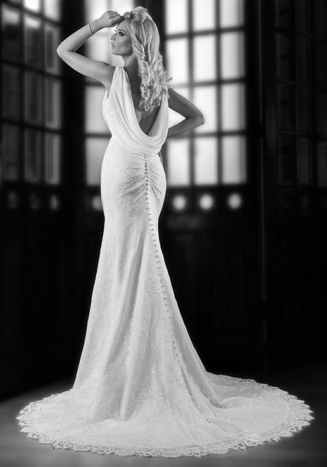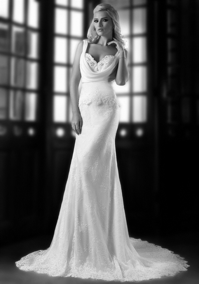 Վզի սրտաձև բացվածքով, անթև, առաջամասում և մեջքային հատվածում թափվող կտորով, նեղ երկար, նորաձև հարսանեկան զգեստ: