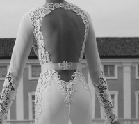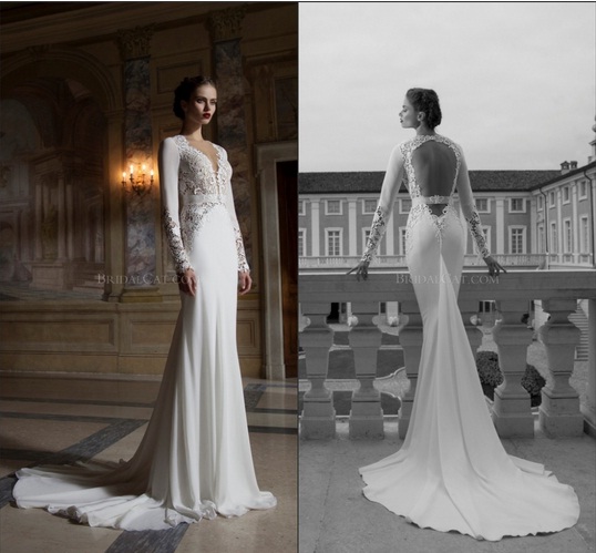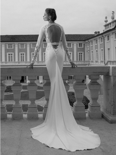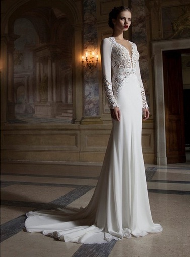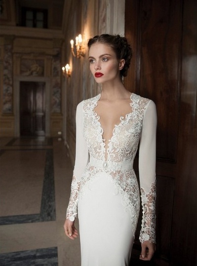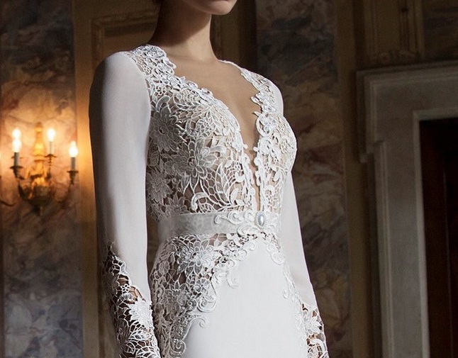 V-աձև բացվածքով, երկարաթև, ժանյակավոր հետաքրքիր դիզայնով, ետևից առանձին երկար հատվածով, էլեգանտ և գրավիչ հարսանեկան զգեստ: