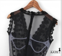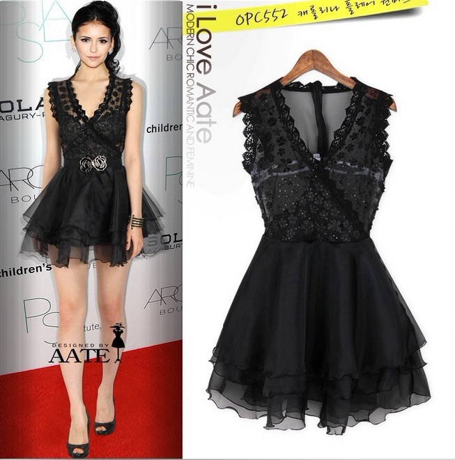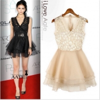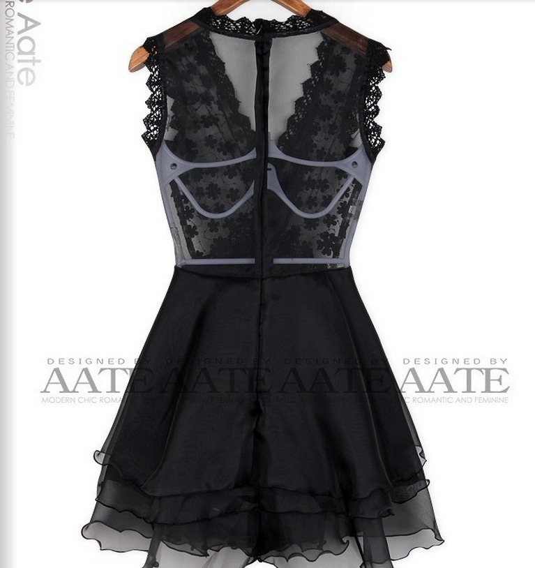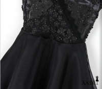 Վզի V-աձև բացվածքով, անթև, մեջքային հատվածում ցանցային, մինչև գոտկային հատվածը ծաղկավոր, գոտկային հատվածից փոռերով, մինի կոկտելային շրջազգեստ: