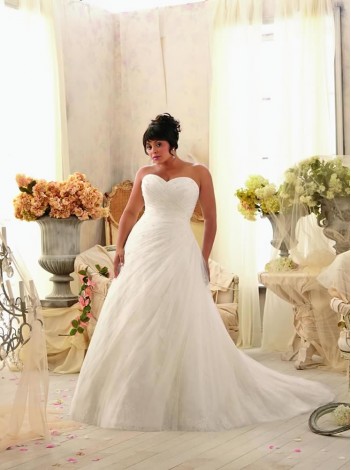 Վզի սրտաձև բացվածքով, գոտկային հատվածից լայնացող, էլեգանտ, նորաձև, մեծ չափի հարսանեկան զգեստ: