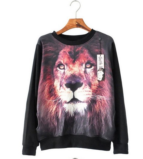 Վզի կլոր բացվածքով, երկարաթև, առաջամասում առյուծի 3D նկարով, նորաձև, ամենօրյա բլուզ: