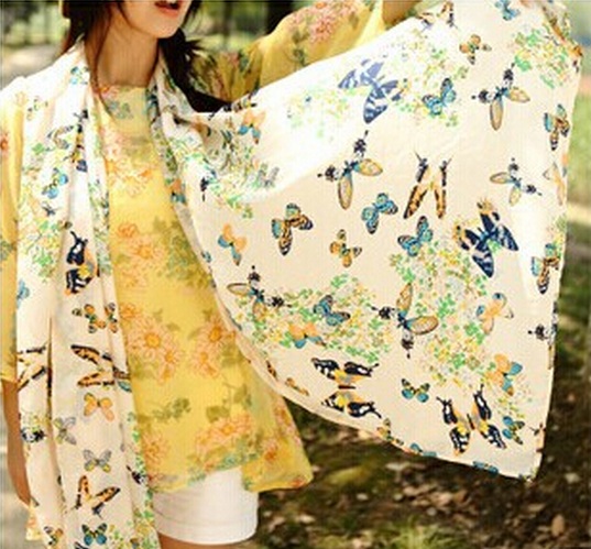 Ամբողջությամբ բազմերանգ թիթեռերի նախշով գեղեցիկ շարֆ: