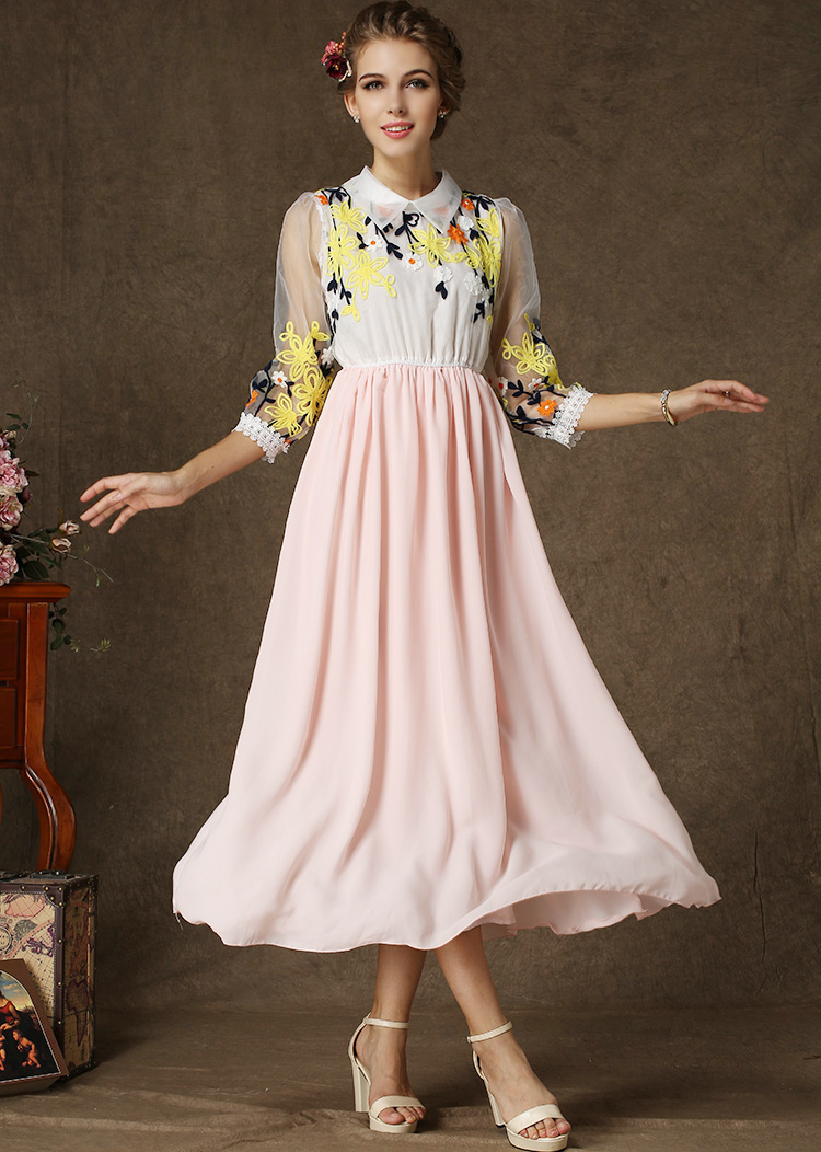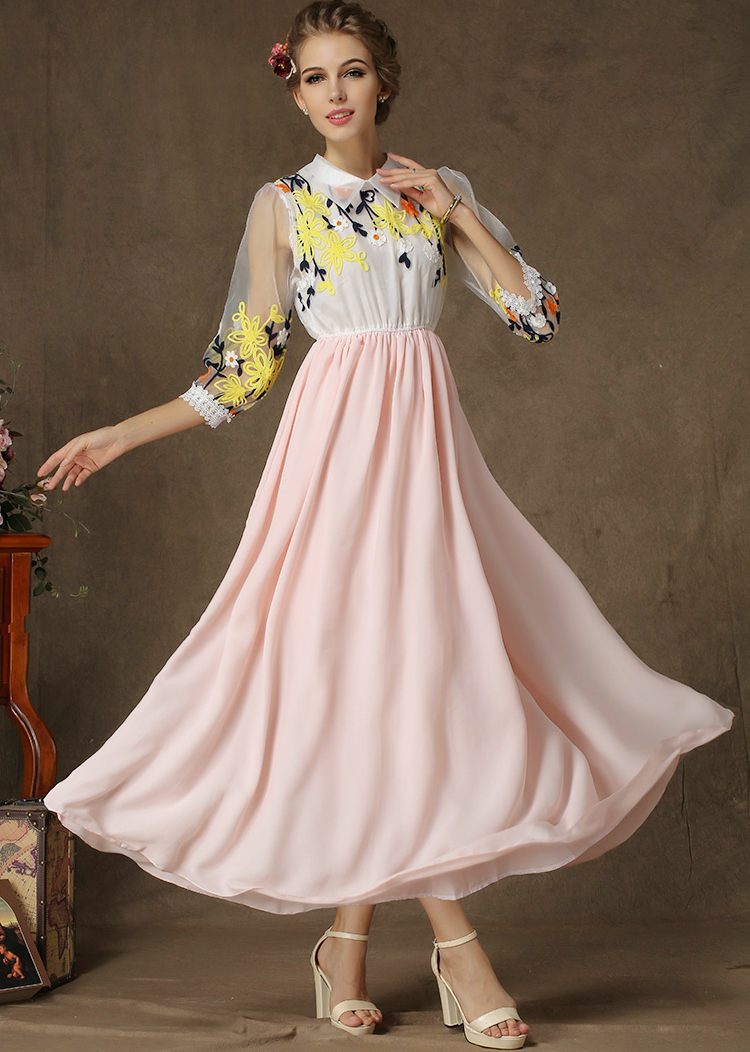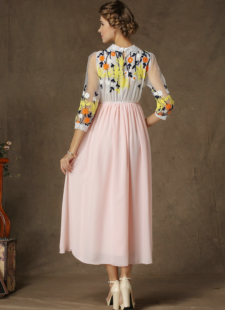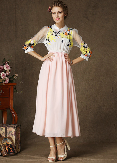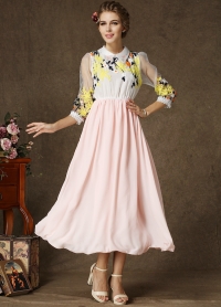 Օձիքով, 3/4 թևերով, վերևի հատվածում ծաղկավոր, գոտկային հատվածում էլաստիկ, երկար, նորաձև շրջազգեստ: