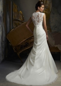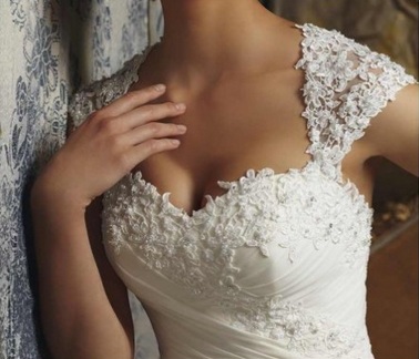 Վզի սրտաձև բացվածքով, առանց թևերի, մեջքային հատվածում ժանյակավոր և կոճակներով, առաջամասում կրծքավանդակի հատվածում ժանյակավոր, երկարնորաձև հարսանեկան զգեստ: