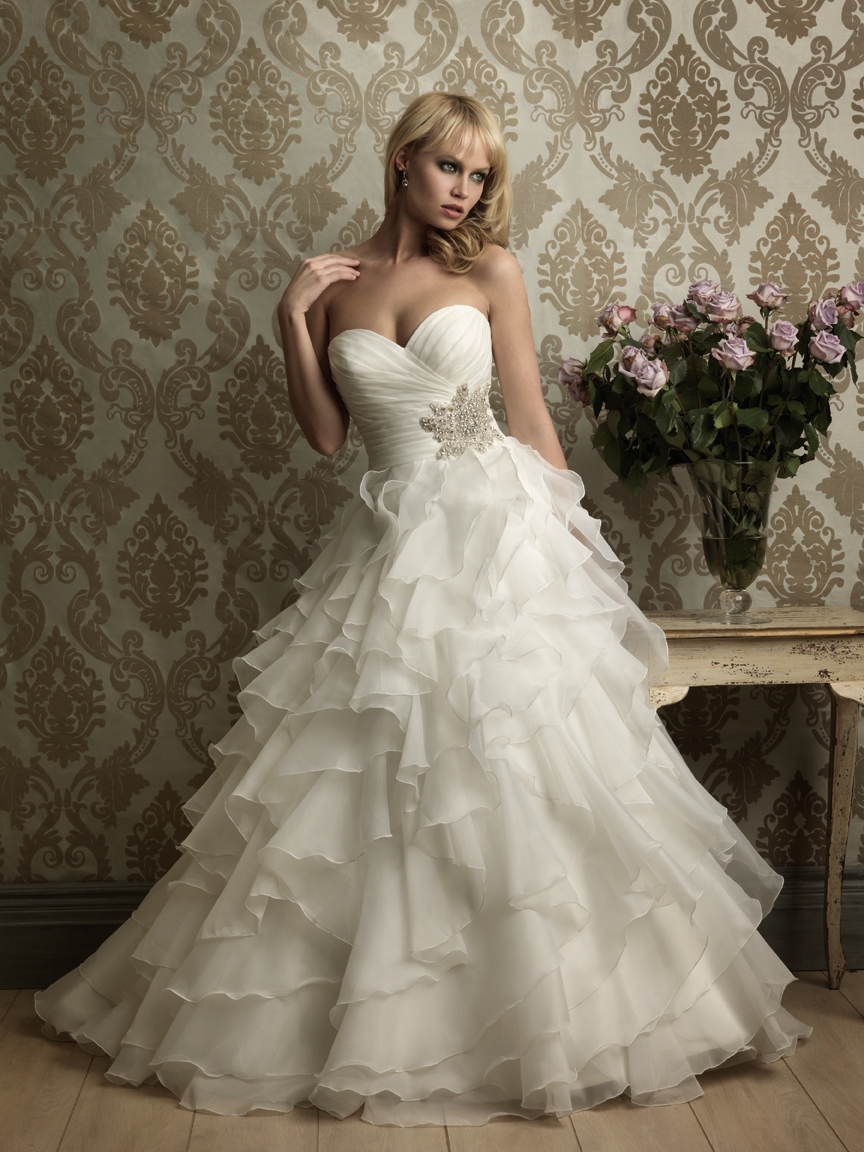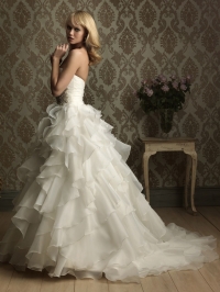 Առանց ուսակապերի, սրտաձև բացվածքովմ գոտկային հատվածում քարերից ծաղկի նախշով, գոտկային հատվածից մեծ և փոքր փոռերով, շքեղ հարսանեկան զգեստ: