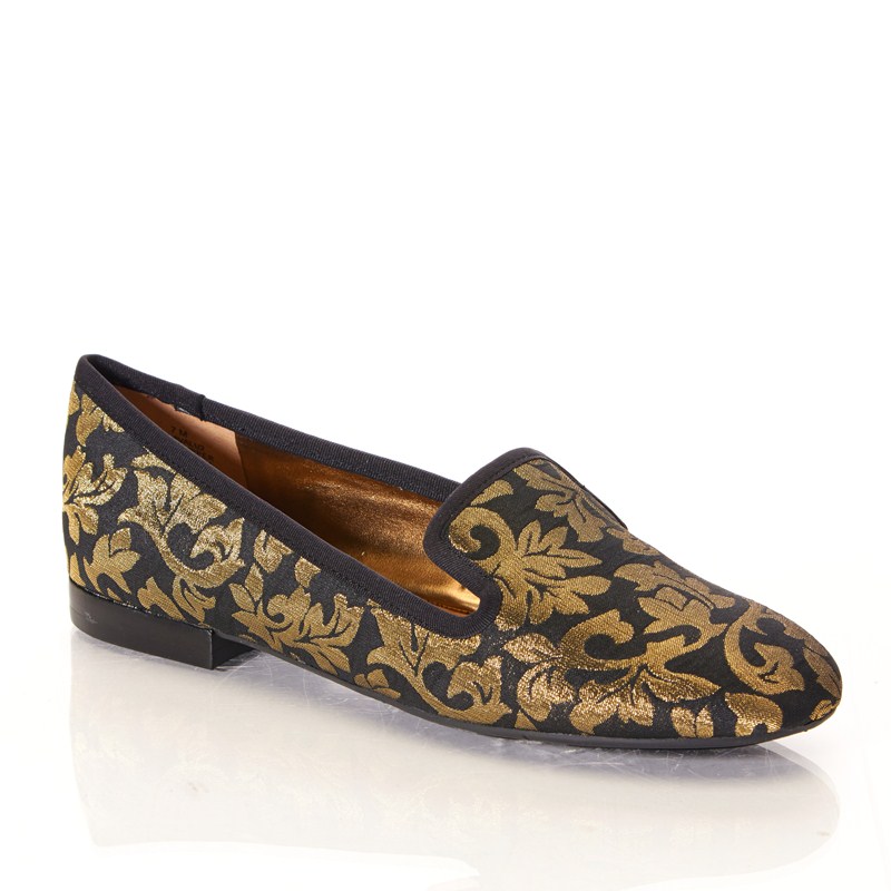 Քթամասում և հետևի մասում փակ, գեղեցիկ բացվածքով, սևի և ոսկեգույնի համադրությամբ, ամբողջությամբ նախշազարդ, նորաձև կոշիկներ: