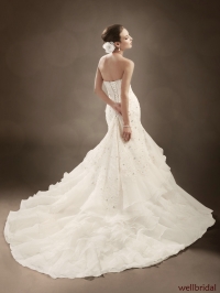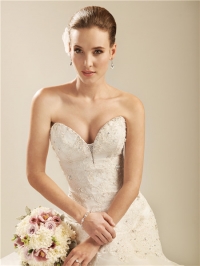 Առանց ուսակապերի, ժանյակավոր, քարերով պատված, վերևից ուղիղ իջնող, ներքևից լայնացող, շքեղ հարսանեկան զգեստ:
