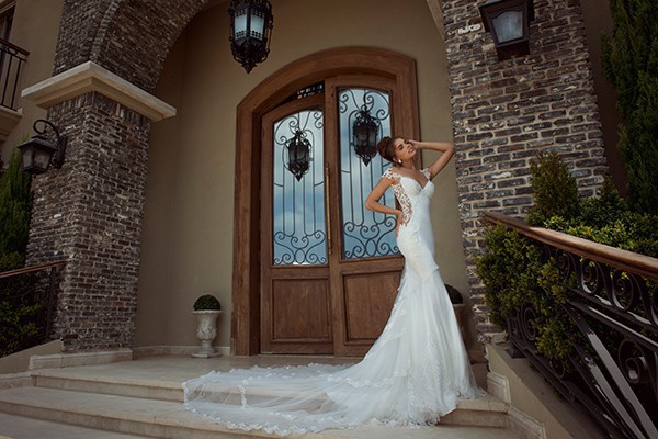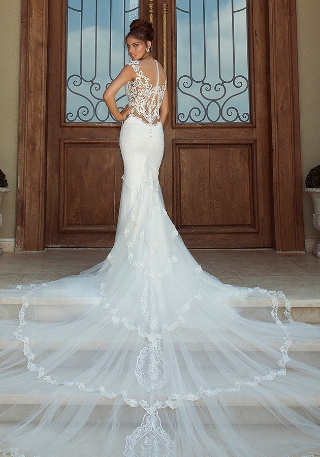 Վզի սրտաձև բացվածքով, մեջքային հատվածում ցանցային ժանյակավոր, երկար փեշով, շքեղ հարսանեկան զգեստ:
