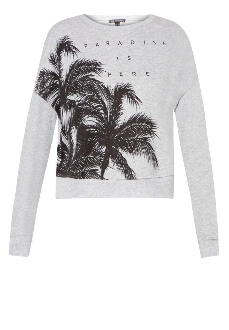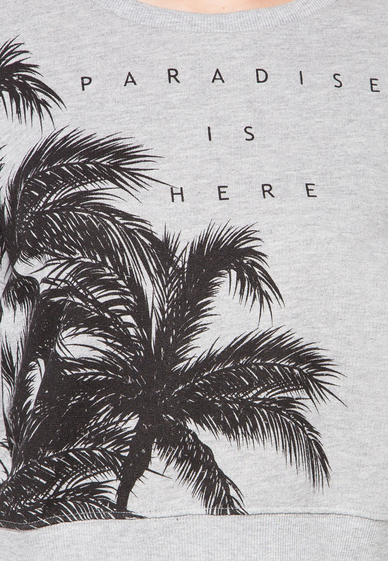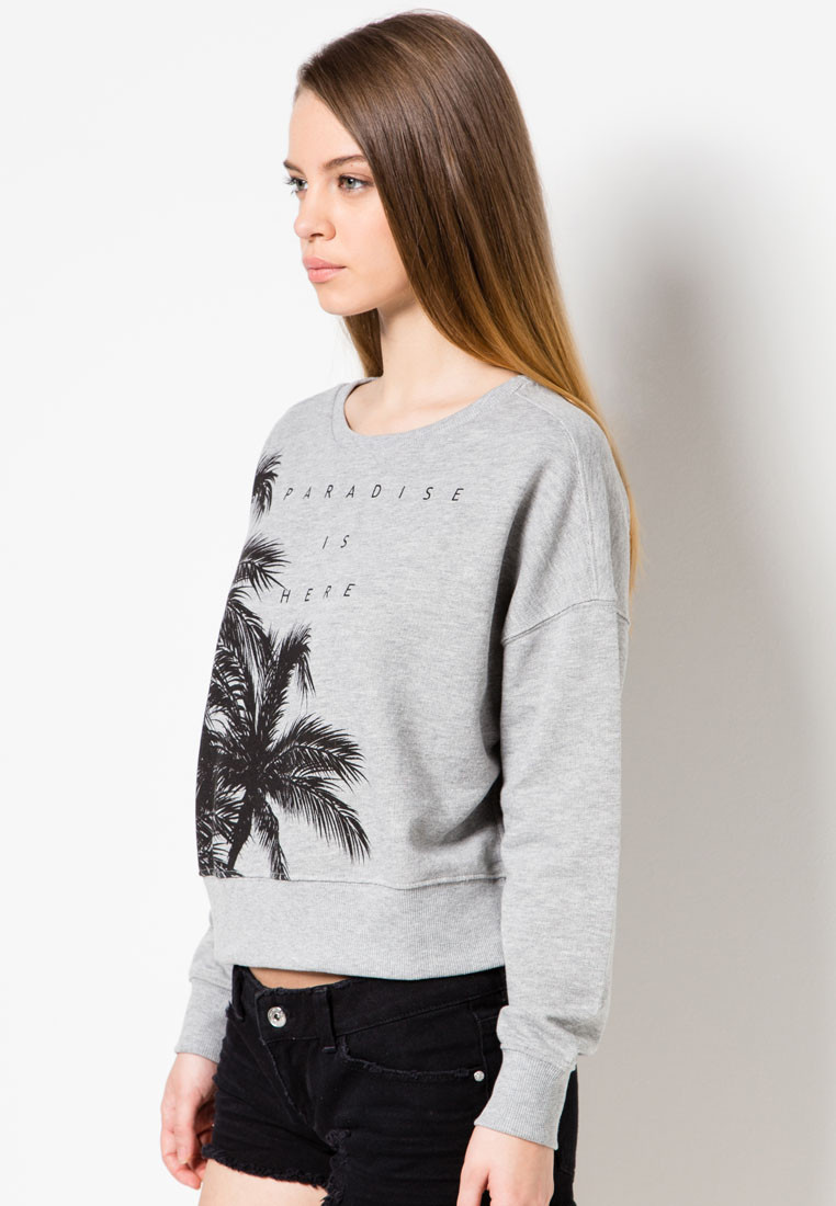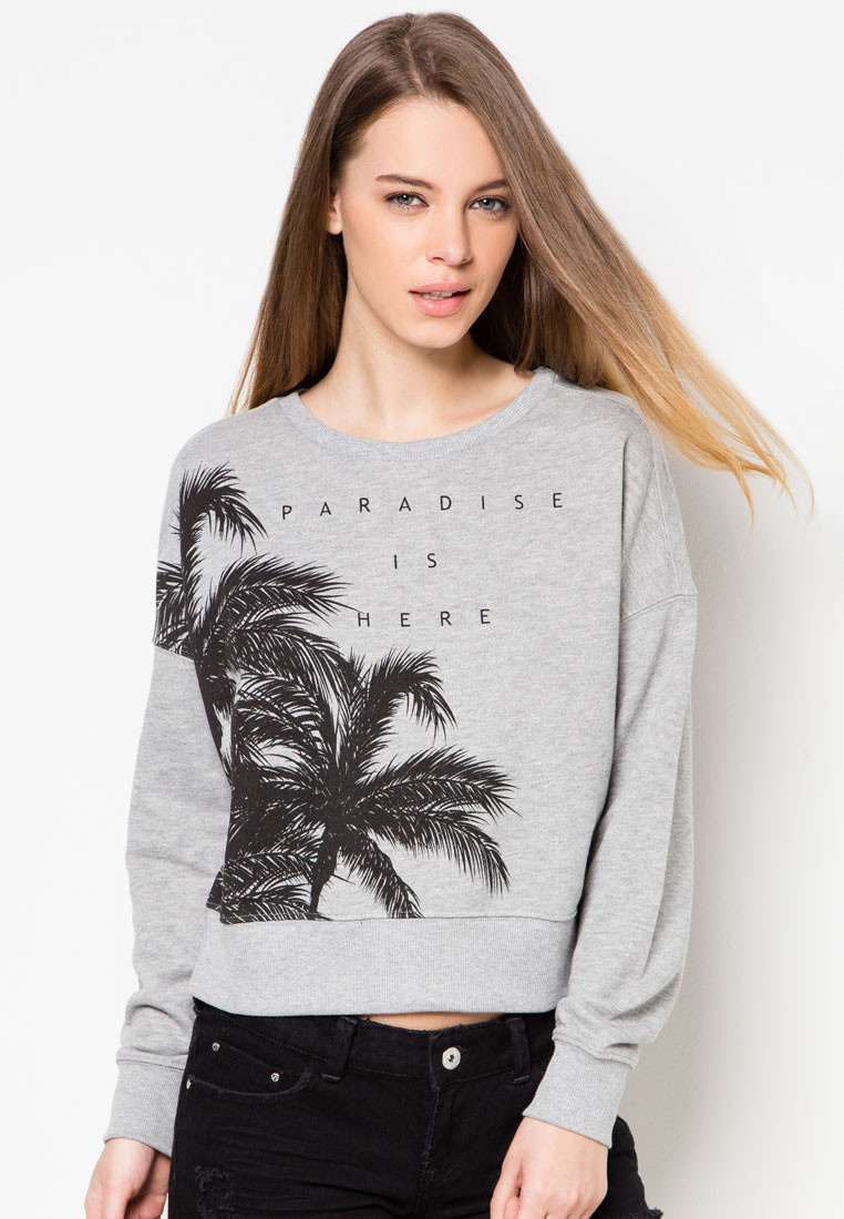 Վզի կլոր բացվածքով, երկարաթև, առաջամասում արմավենիների նախշով և "paradise is here" գրվածքով, ամենօրյա, նորաձև բլուզ: