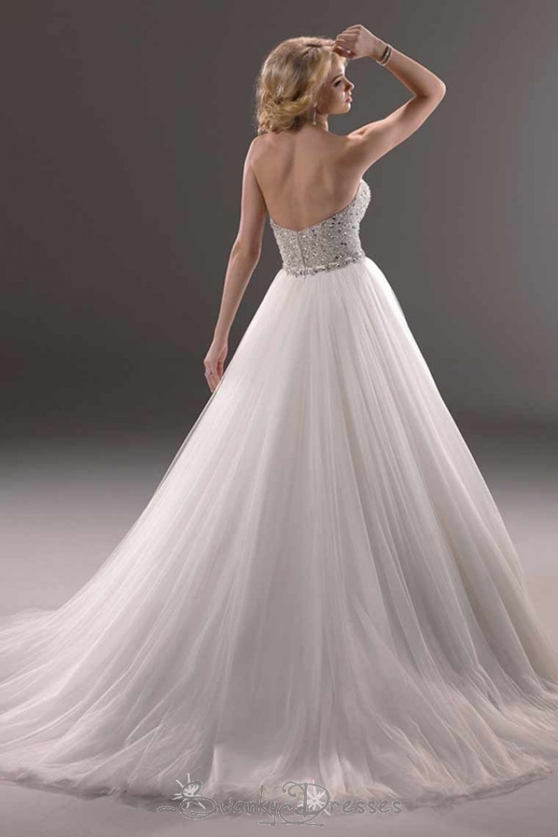 Առանց ուսակապերի, բաց մեջքով, գոտկային հատվածում ձգված քարերով գոտիով, վերևի հատվածում ժանյակավոր, գեղեցիկ հարսանեկզն զգեստ: