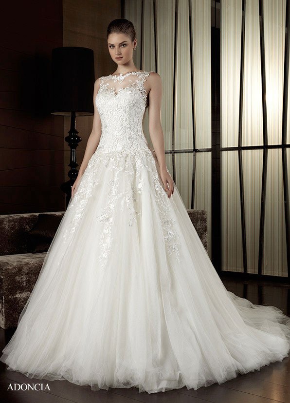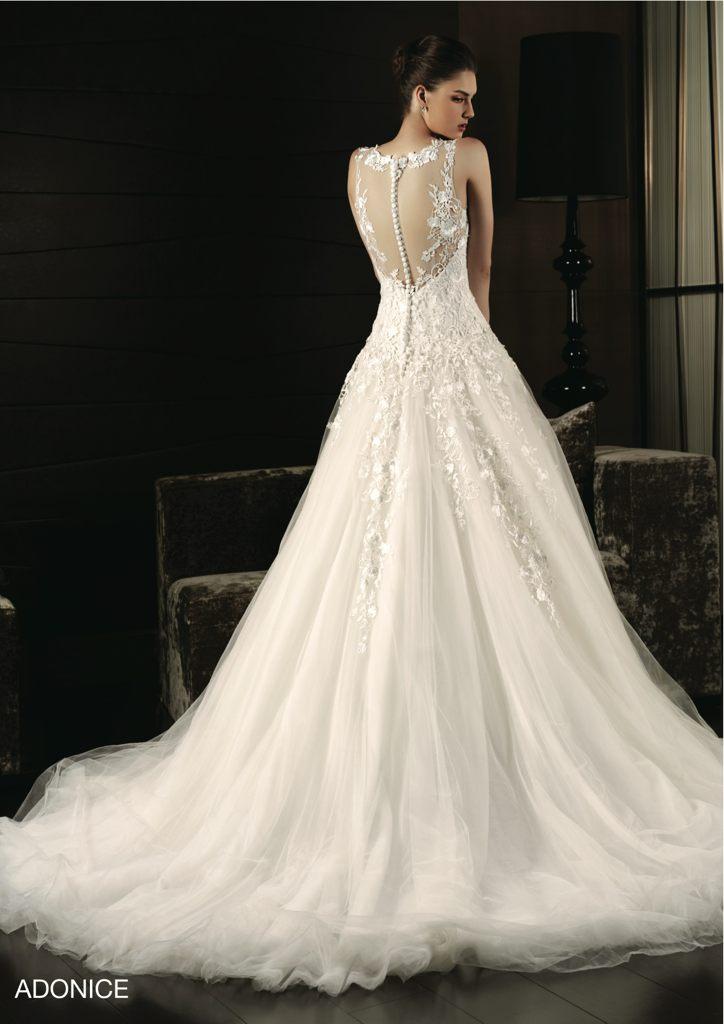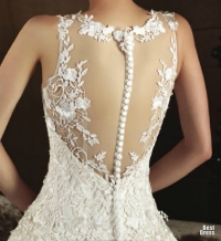 Վզի կլոր բացվածքով, անթև, մեջքային հատվածում մարգարտե կոճակներով, գոտկային հատվածից լայնացող, շքեղ հարսանեկան զգեստ: