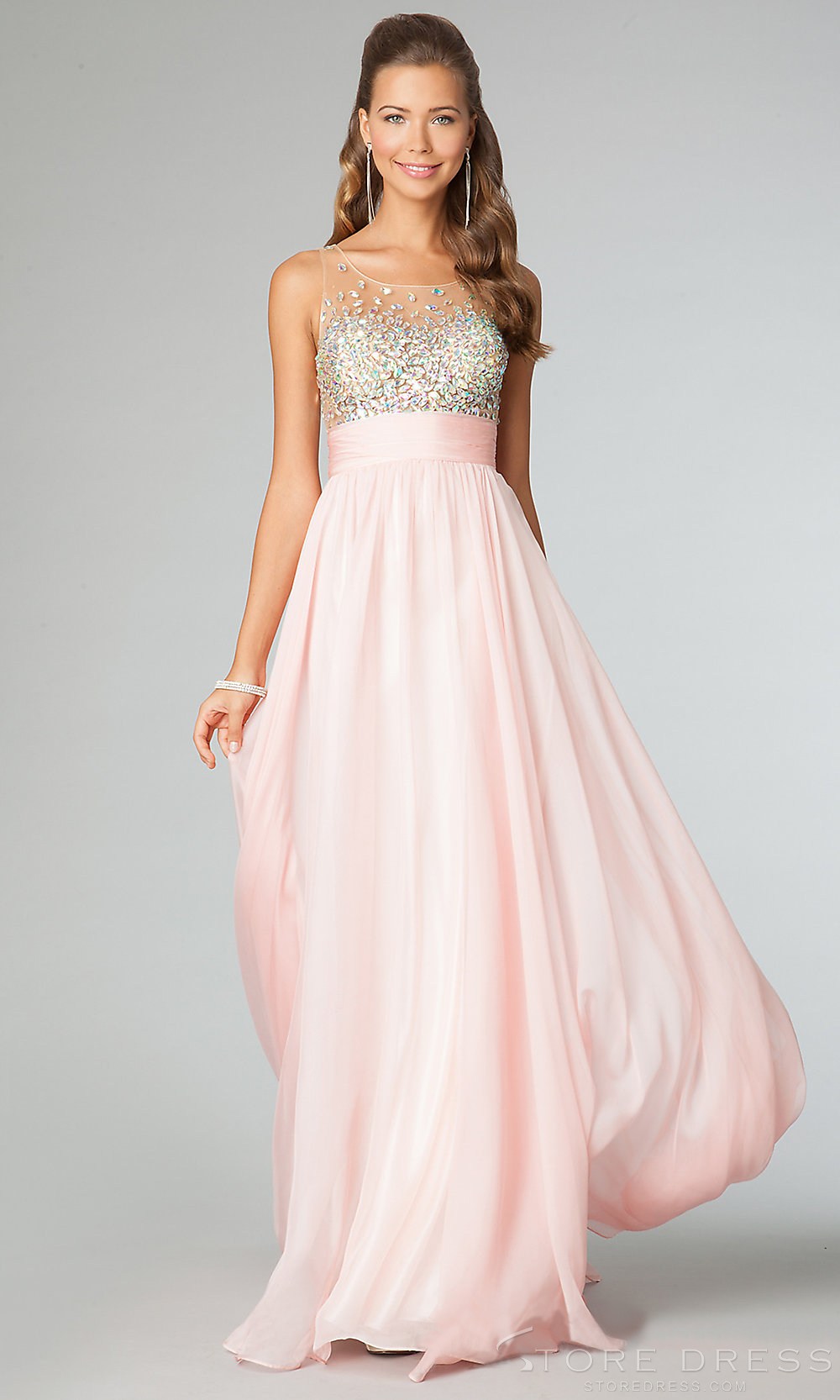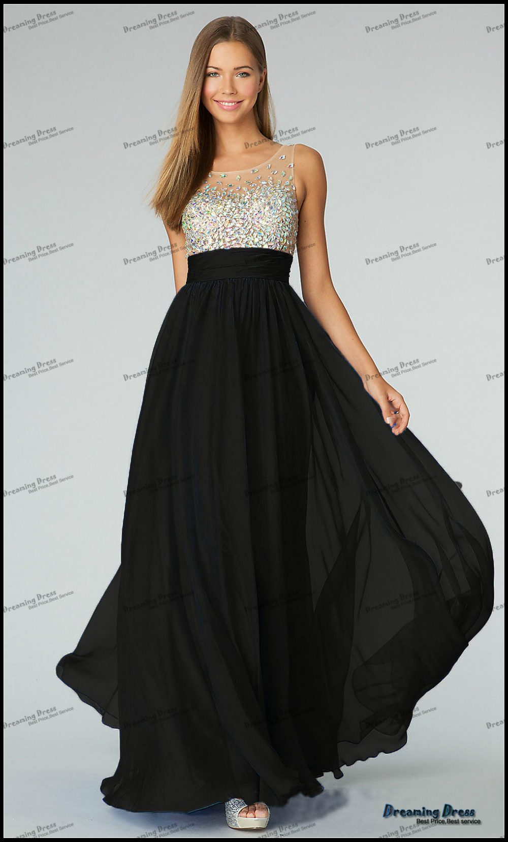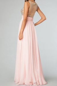 Վզի կլոր բացվածքով, ցանցային մեջքով, վերևի հատվածում քարերով պատված, գոտկային հատվածում նույն կտորից գոտիով, երկար, էլեգանտ, շքեղ երեկոյան զգեստ: